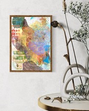 木製のパネルに、アクリル絵の具でのペイントとジェリープリントで自作した紙をコラージュしたミクスドメディアの作品になります。紙は透明になり繊細に重なった景色を作ります。
