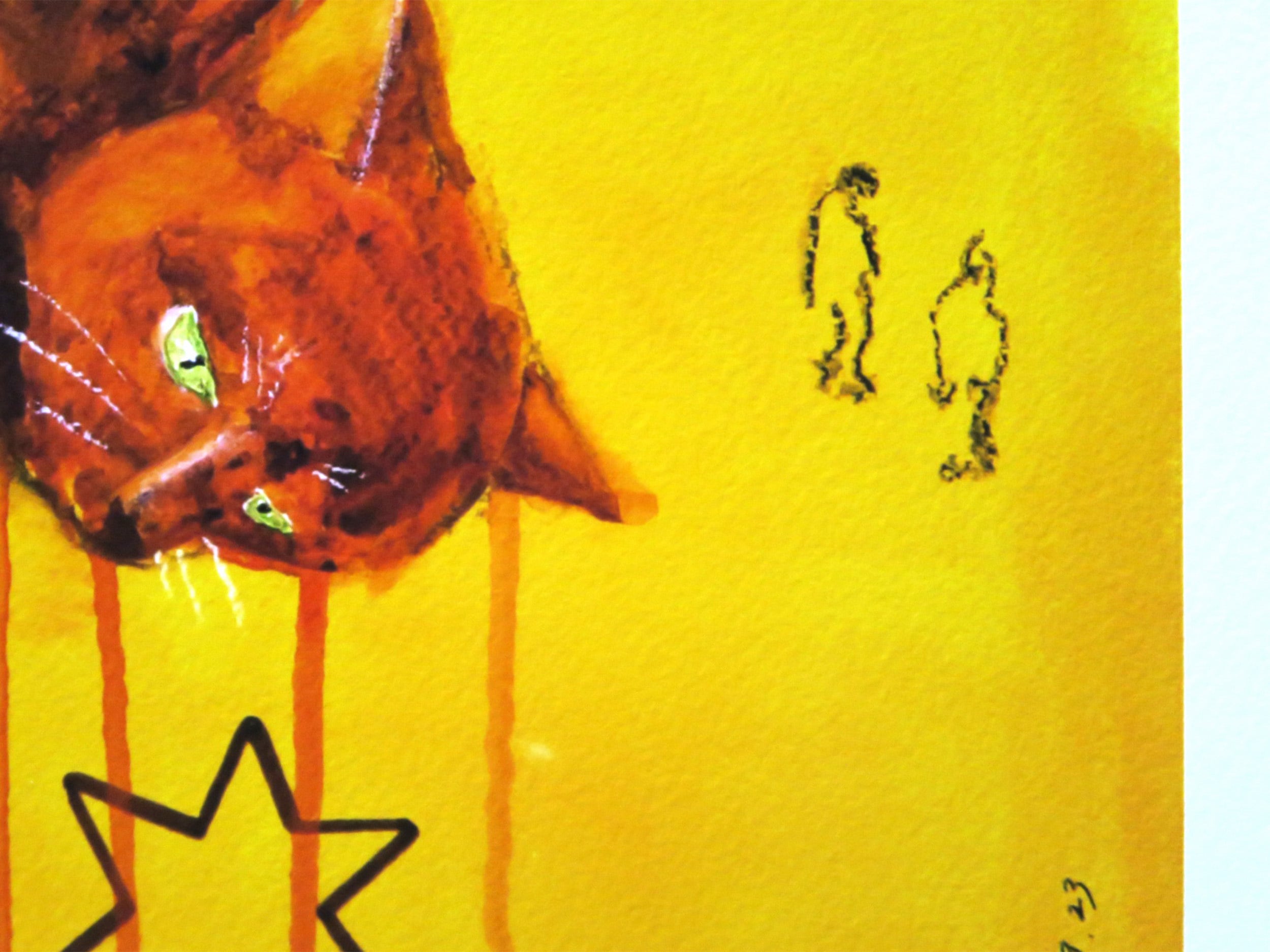 「デンマークに短期留学時、美術の授業で描いた絵。寄宿学校にいた猫とデンマーク第2の都市オーフスの景色をモデルにしている。「普通は目に見えない大きな猫」という設定で、人々の近くでゆったりと寝転んでいる様子を描写。日常の景色の中に潜む、大きな存在の気配を表現した。「Kat i Aarhus - II」と対をなす作品。」(SAYA MIZUNO)