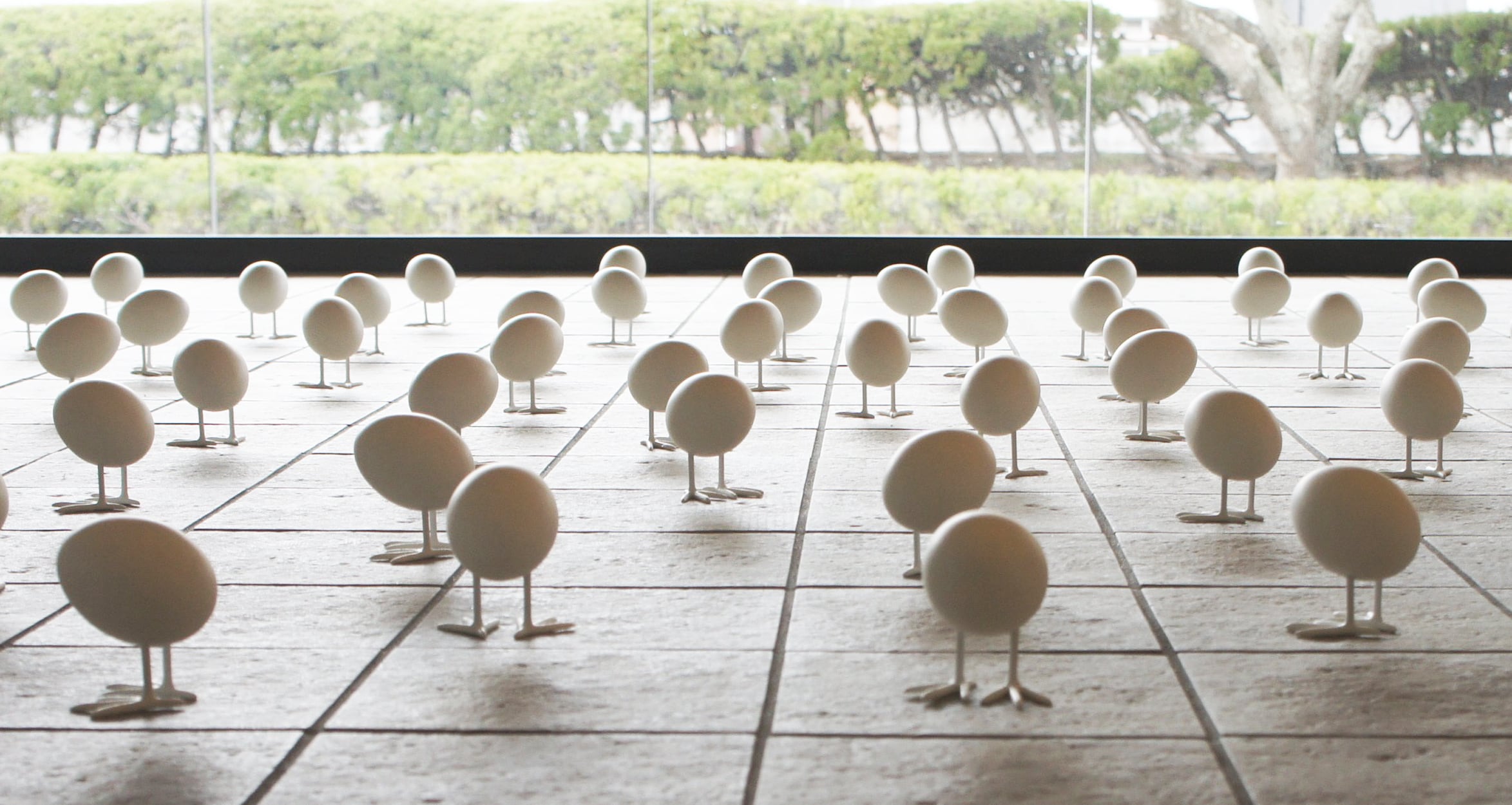 「インスタレーション用に制作した立体作品。始まりと可能性を鳥になぞらえたキャラクターです。会場では約140体での展開を想定していますが、展示用とは別に60体( エディションナンバー . サイン入 )を個別に限定販売します。」(田中直樹)
