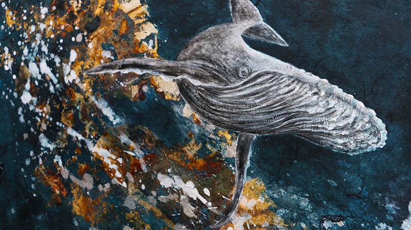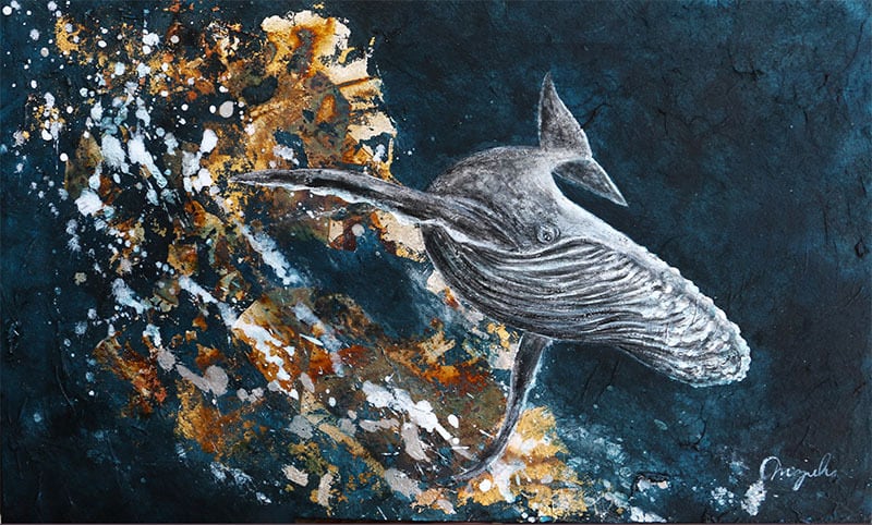 加熱温度により変化する銀箔が、深海にも宇宙にも見える幻想的な世界を生み出し、その中を悠然と泳ぐ鯨は、時空を超える命の象徴のようにも映ります。