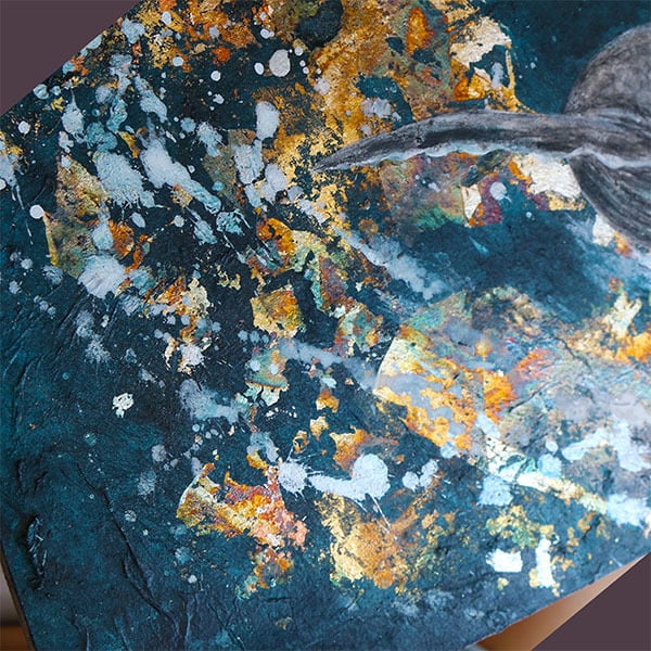 銀箔は酸化によって変容し、偶然に生まれる色彩が、宇宙の爆ぜる星々や深海に揺れる光の粒のような風景を描き出します。