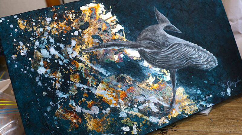 The silver leaf changes depending on the heating temperature, creating a fantastic world that looks like the deep sea or the universe, and the whale swimming leisurely through it seems to be a symbol of life that transcends time and space.