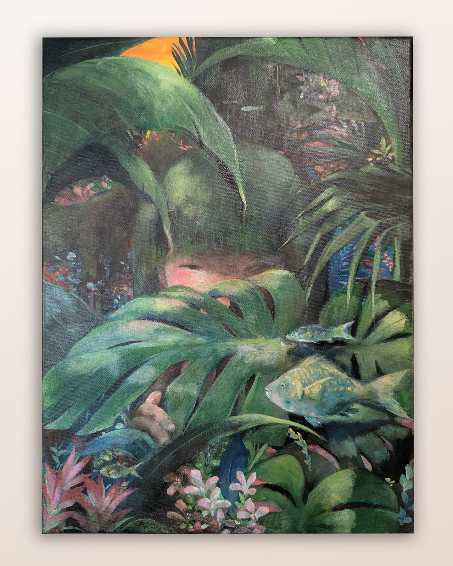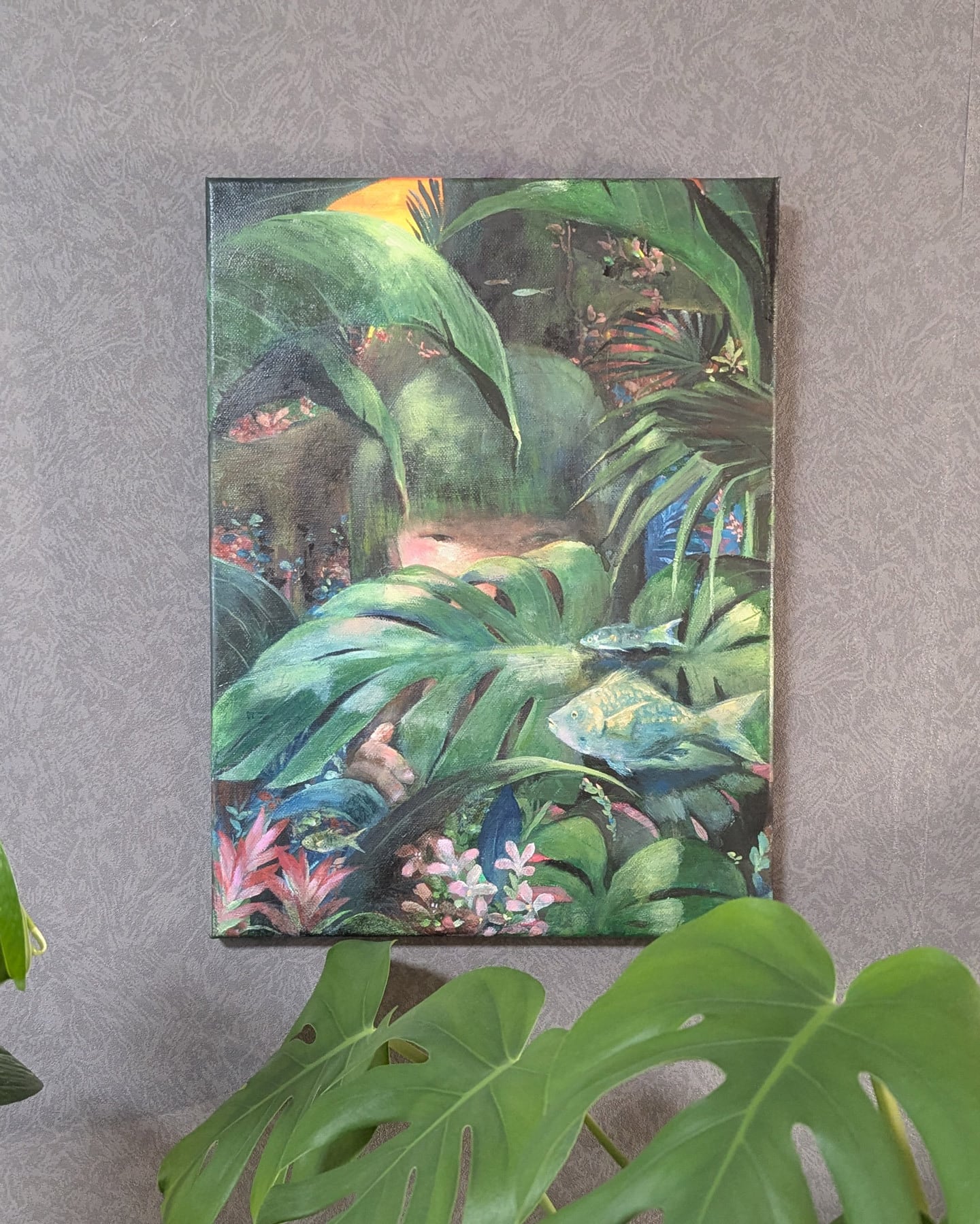 商業出版を前提としない、アートとしての絵本を制作できないかと模索中です。鹿児島県奄美地方の方言で「海の彼方の楽園」を意味する「ネリヤカナヤ」をタイトルに掲げ、奄美地方の自然や伝承をベースに絵物語にしようと考えています。この作品はこの絵本構想のための習作のひとつです。(さかとくみ雪)