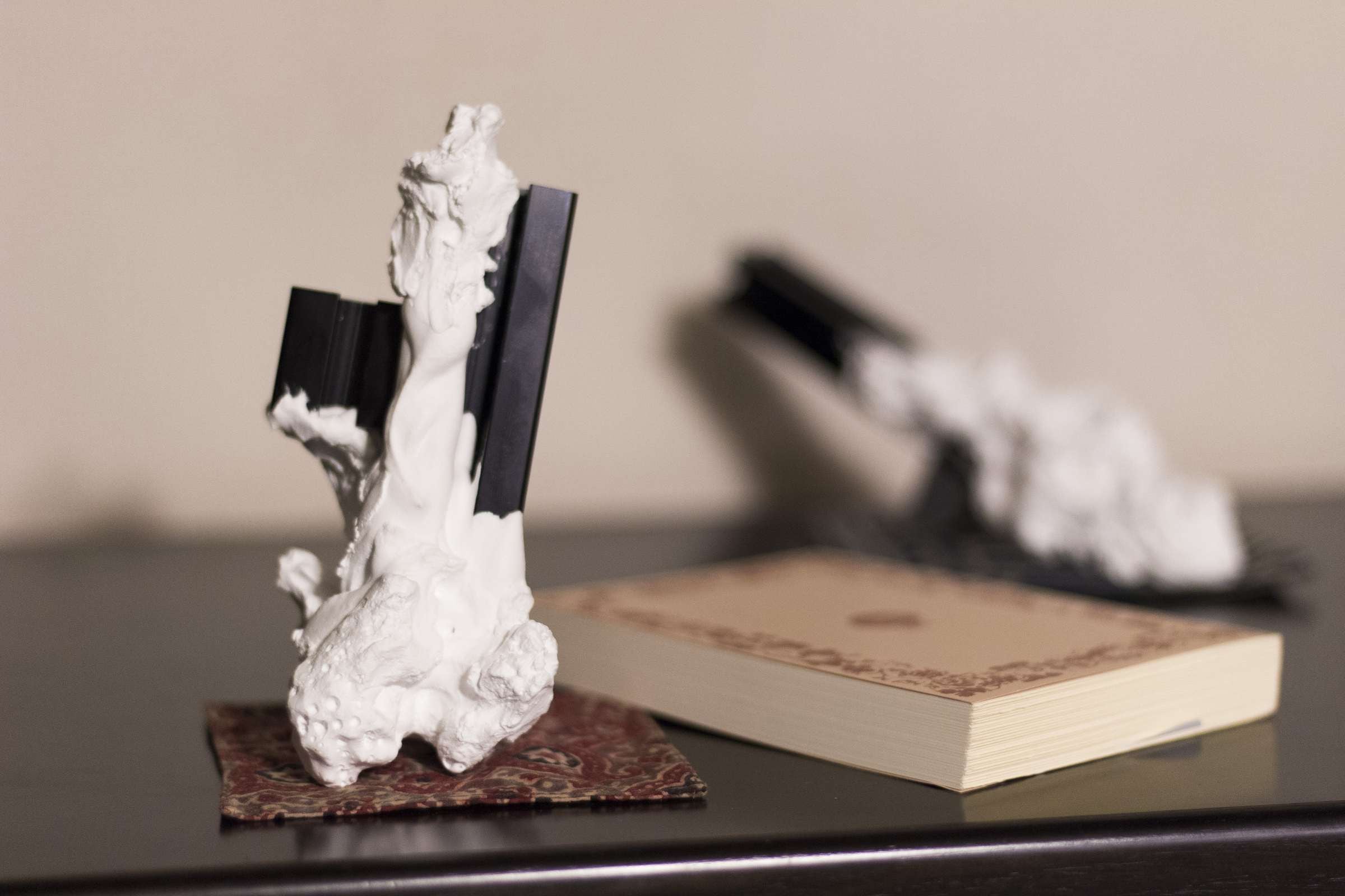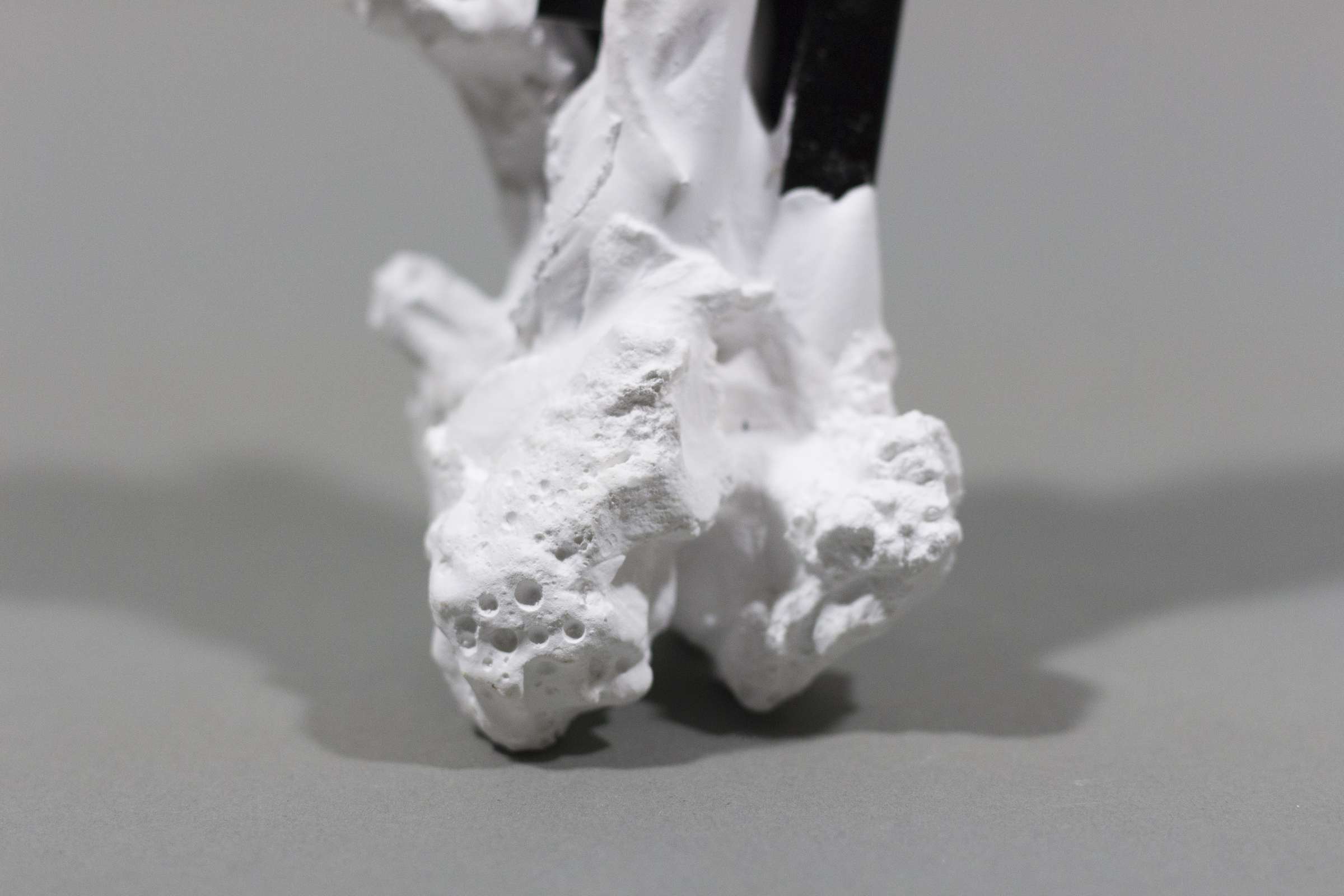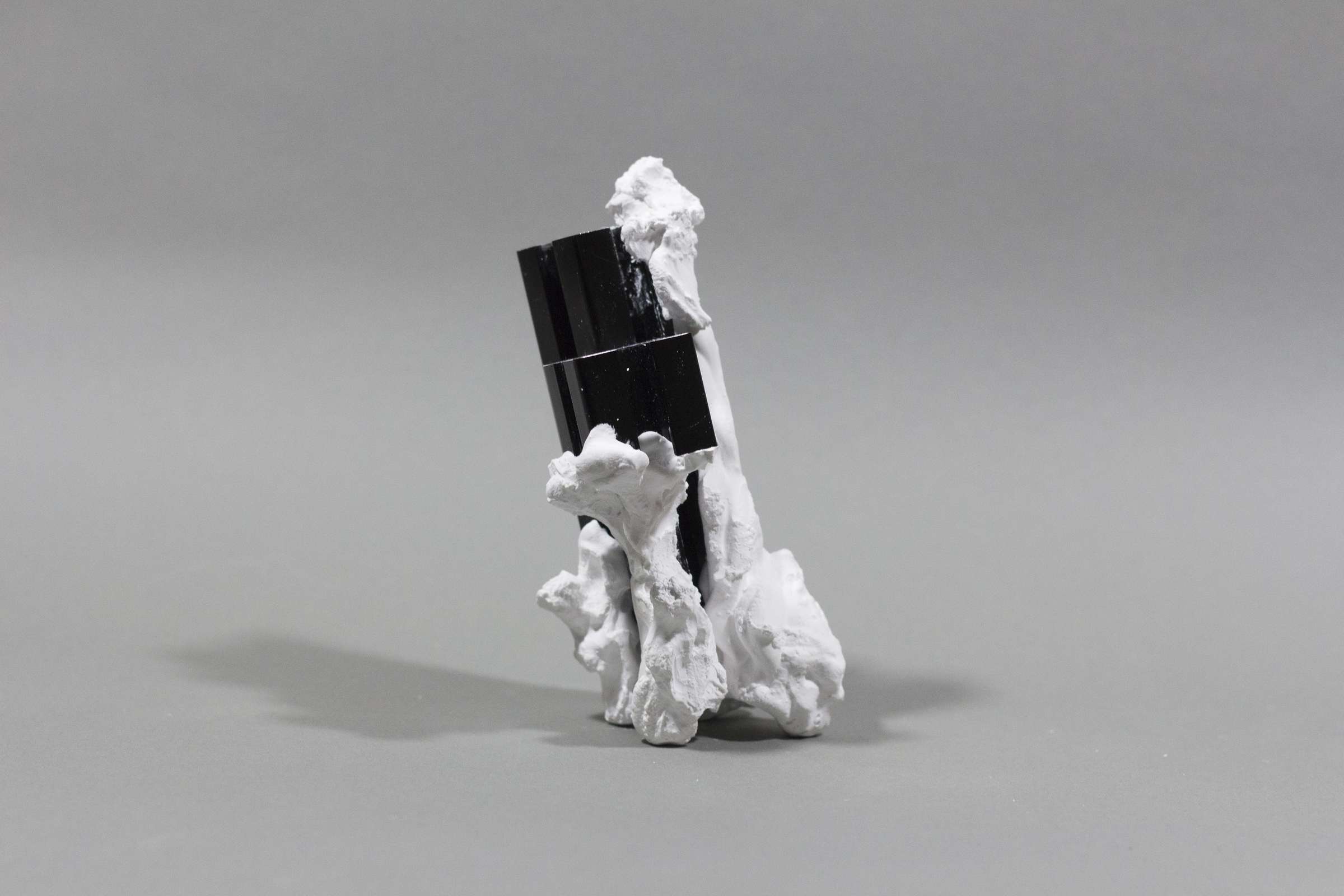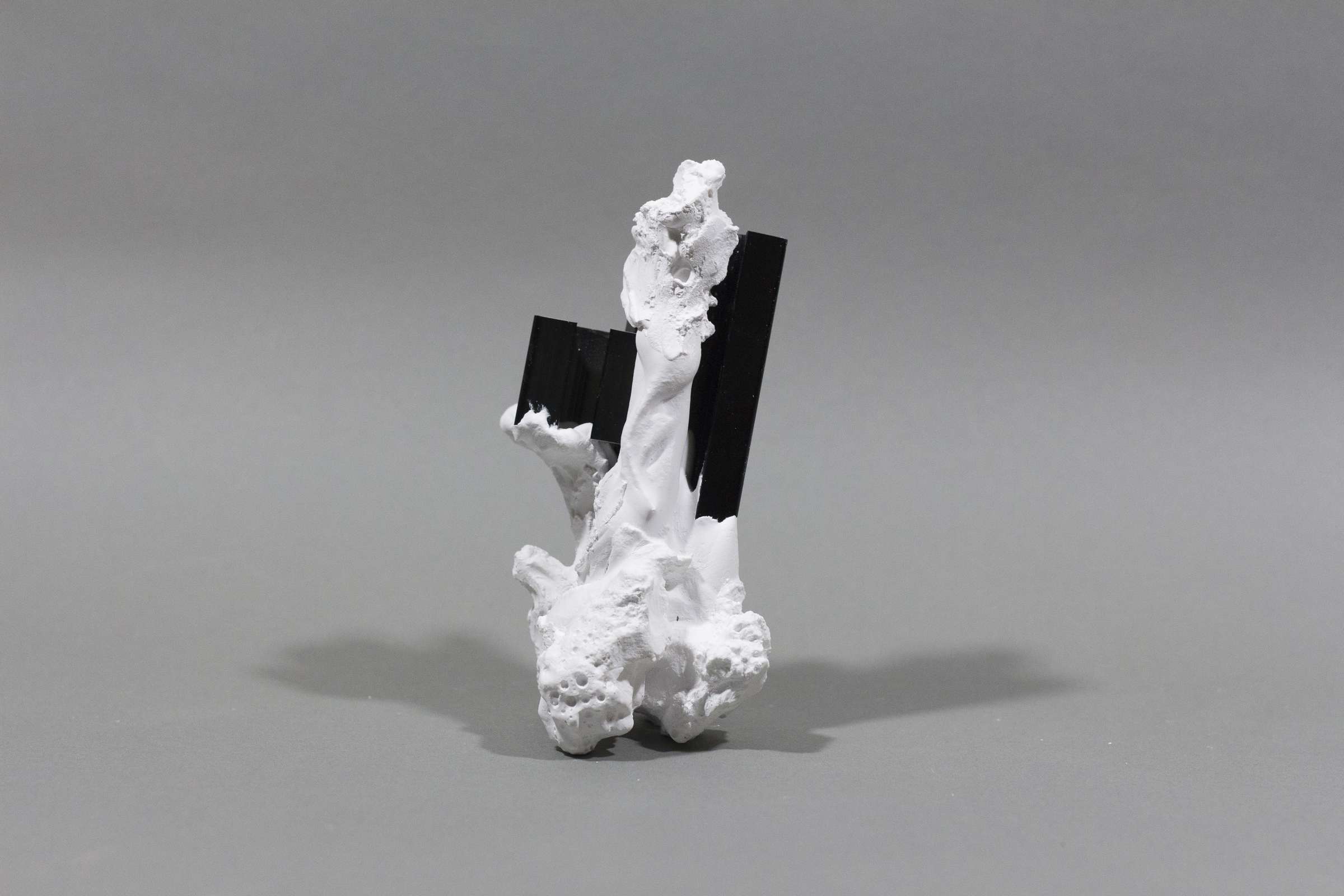 《remnant》は、工業用アルミフレームに半硬化の石膏を塗布し、有機的な造形を施したシリーズです。人間が世界を理解し秩序化するために用いる「フレーム」、そしてそこからこぼれ落ちるものへの関心から生まれた本作は、装飾を自律的な外部として分析した《Rampant on a frame》の新たな展開にあたります。対照的な二つの造形は、秩序と逸脱、人工と自然、意図と偶発の境界を曖昧にし、フレームという構造そのものを問い直します。硬化の過程で生まれる石膏の不定形な痕跡は、作家の手によって追認され、造形としての体系を獲得していきます。フレームに宿るこの生成は、例えば漂着物を覆う藻や貝のように、静かにフレームとの関係を更新していくのです。(西永和輝)