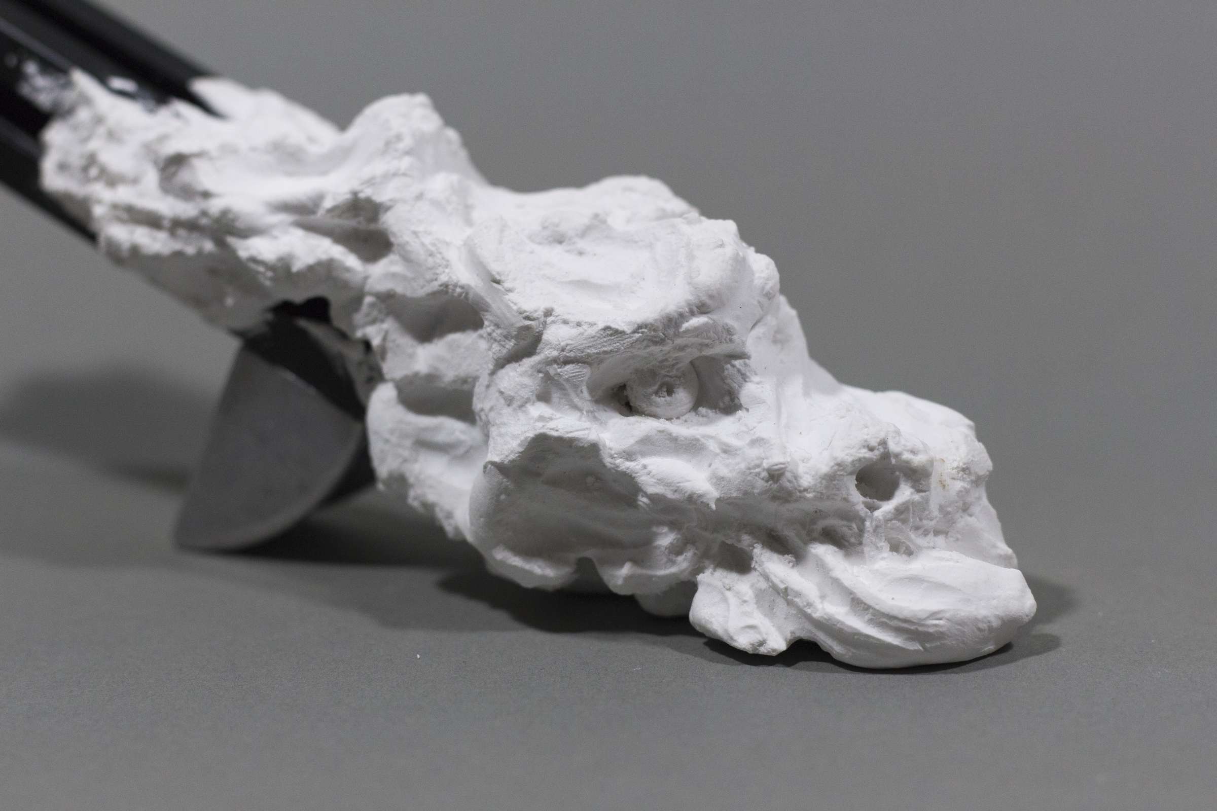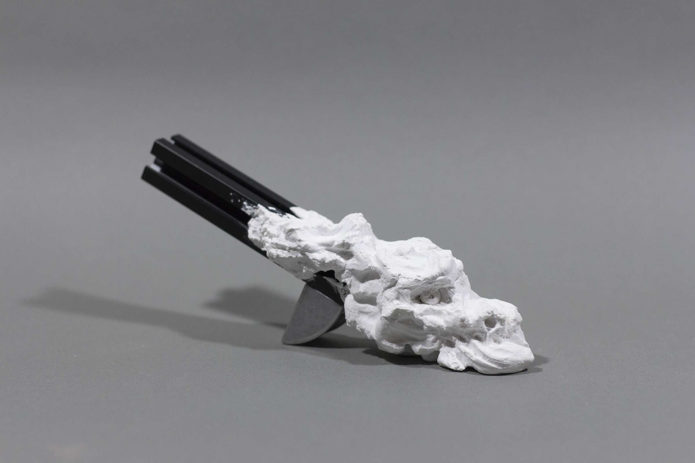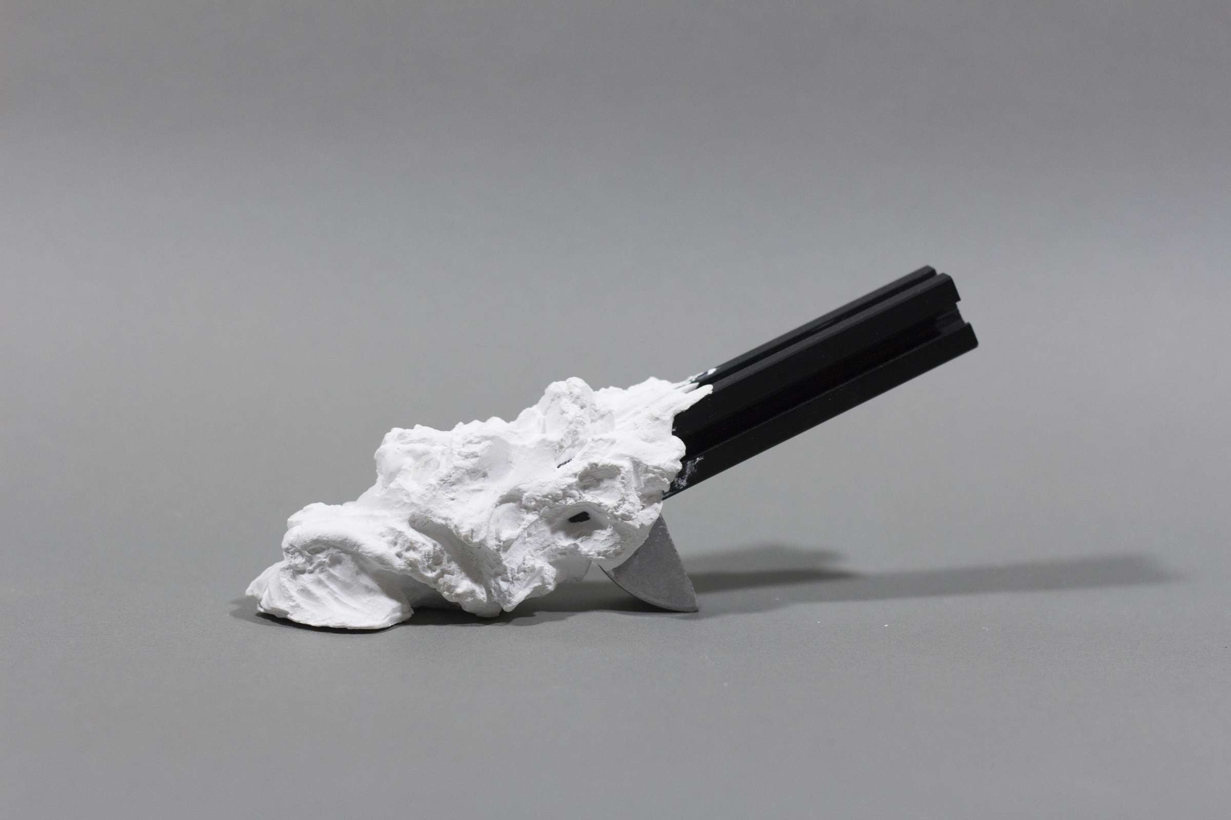 《remnant》は、工業用アルミフレームに半硬化の石膏を塗布し、有機的な造形を施したシリーズです。人間が世界を理解し秩序化するために用いる「フレーム」、そしてそこからこぼれ落ちるものへの関心から生まれた本作は、装飾を自律的な外部として分析した《Rampant on a frame》の新たな展開にあたります。対照的な二つの造形は、秩序と逸脱、人工と自然、意図と偶発の境界を曖昧にし、フレームという構造そのものを問い直します。硬化の過程で生まれる石膏の不定形な痕跡は、作家の手によって追認され、造形としての体系を獲得していきます。フレームに宿るこの生成は、例えば漂着物を覆う藻や貝のように、静かにフレームとの関係を更新していくのです。(西永和輝)