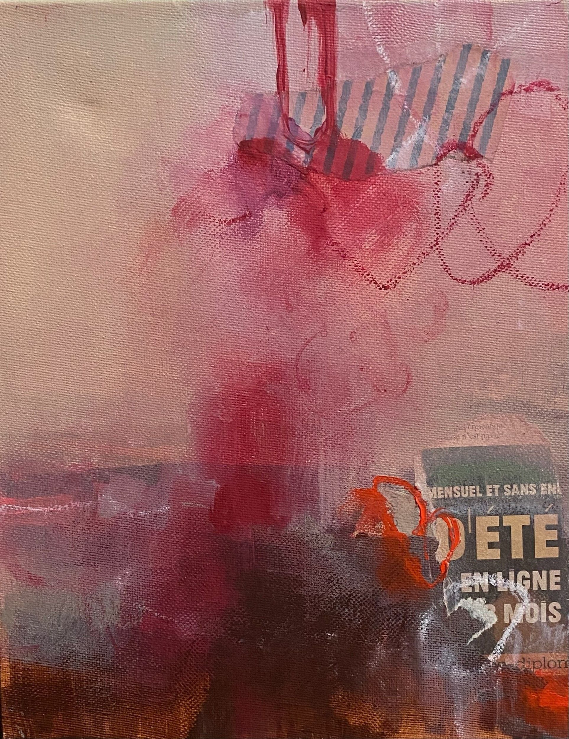 この絵は数年前滞在した南仏で描きました。南仏の夏は強い日差しにカラッとした空気。ミスティーユと呼ばれる夕方の微風が心地良かったです。南仏の夏はみんなロゼワインを飲みます。ふっと頭に浮かんだこの絵の赤とピンクは、今思えば南仏の夏のワインの色だったのかもしれません。燃え上がるような炎の赤を抑えるように、コラージュ(フランス語で夏の意味)を施し遊んでみました。今アフリカの熱帯に住んでみて、南仏のあのカラッとした空をとても懐かしく思い出します。(Yasuko Okamoto)