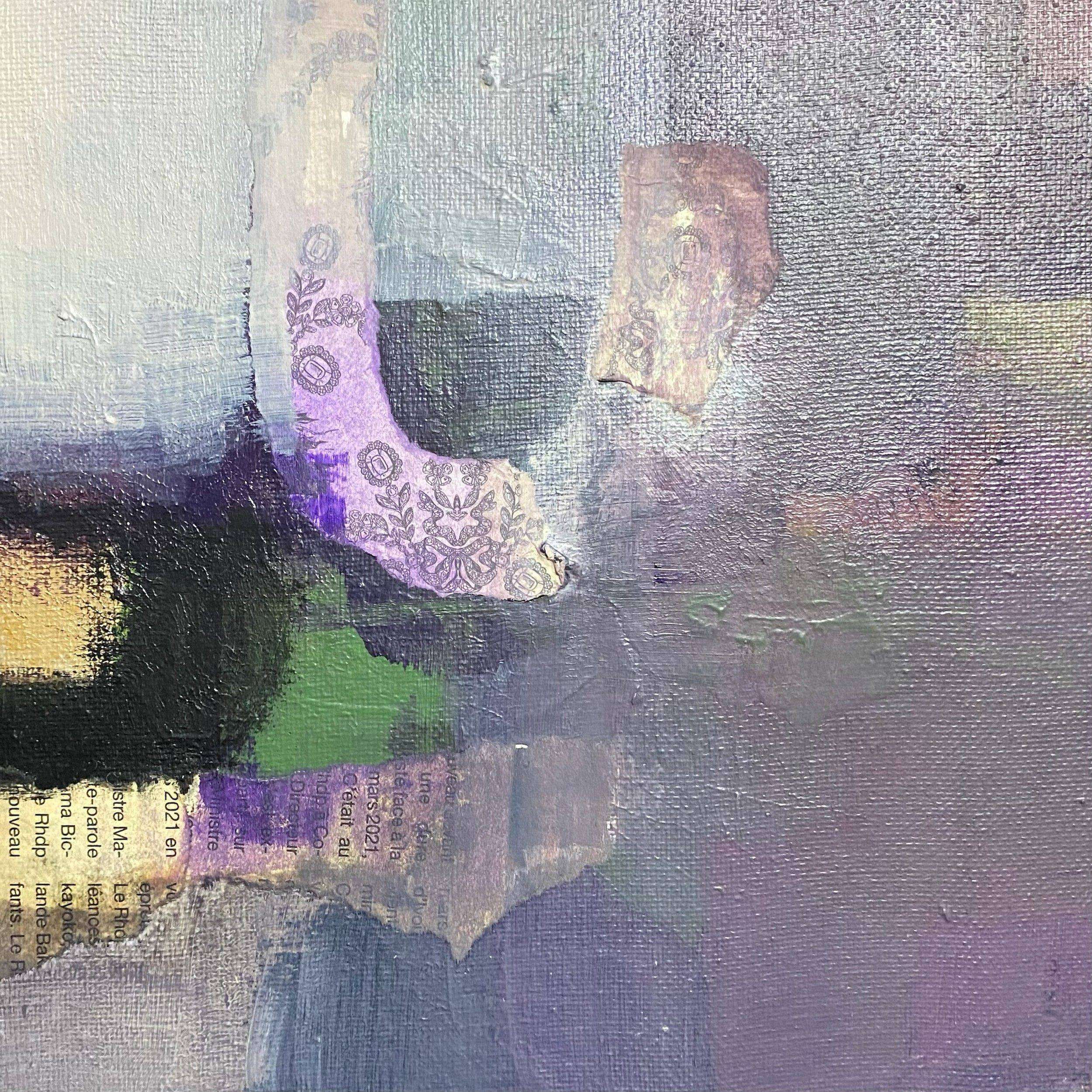 この作品は何度も絵の具を重ねるうちに、ちょっと和風な色合いが出たのが気に入っています。今生活している西アフリカで制作しましたが、最近日本を懐かしむような和の色合いがなぜか強くなってきました。またコラージュの紙の凸凹や、黒い絵の具のシミも偶然ならではの不完全さ、もしくは愛嬌が出た一枚だと思います。AIの出現により完全な美が実現する世の中ですが、私はむしろ人の持つ滑稽さや不恰好なものにこだわっていたいと思います。タイトルの砂時計は、アナログな方法で時間を刻むものとしてふと浮かんだものです。あなたはどんなタイトルをつけますか?(Yasuko Okamoto)
