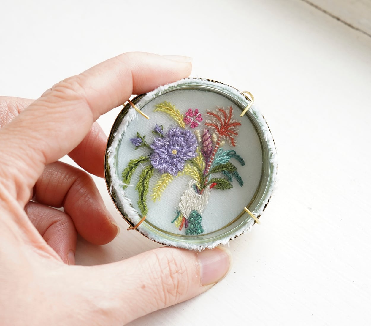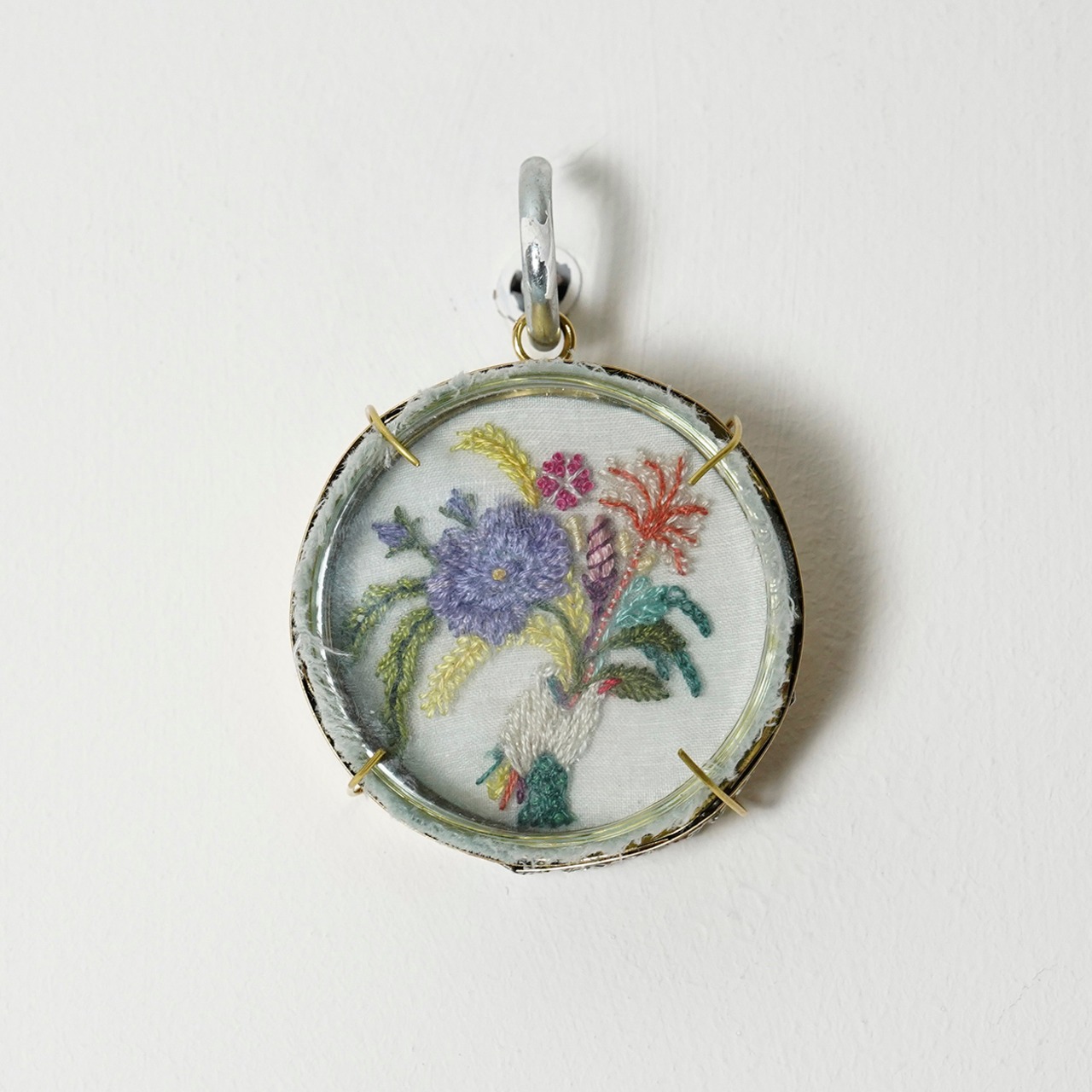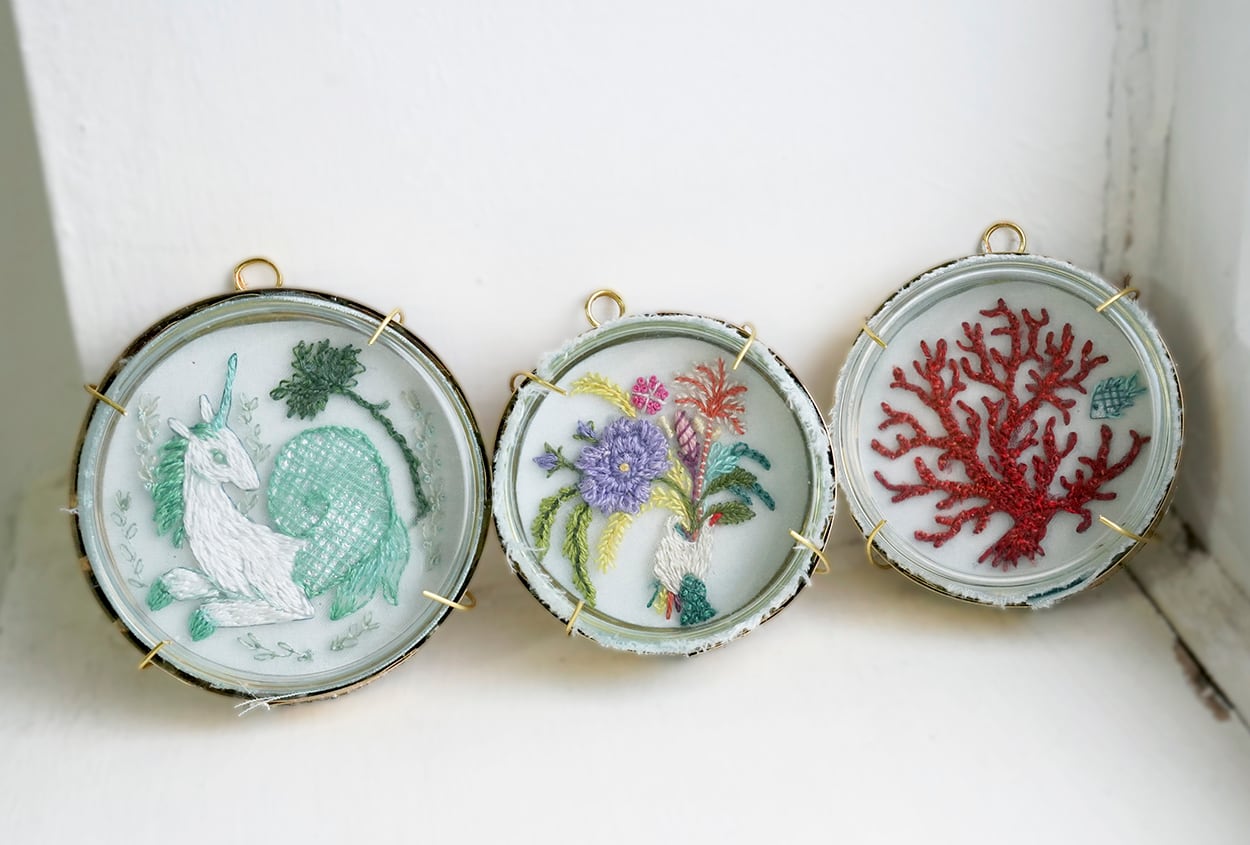 メディア:シルクに刺繍、紙、真鍮、ガラスシャーレ