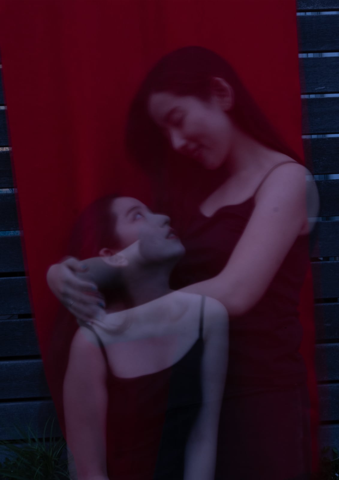 長時間露光によって画面上に2人/3人の鈴木紅璃を物理的に焼き付けた本作は、複数のルーツを持つ自分と同じアイデンティティの人間がいない孤独のなかで生じた「仲間が欲しい」という衝動を出発点としている。