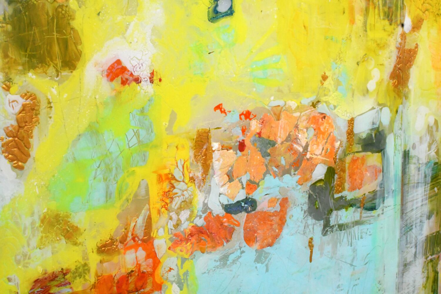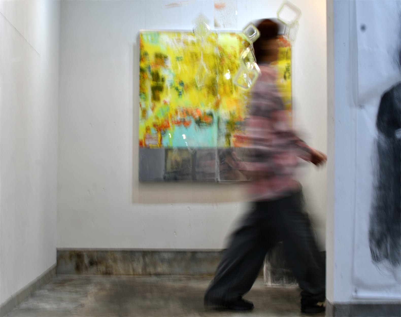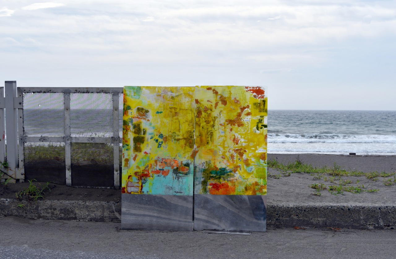 この作品は、絵具の透明度をコントロールしながら、背後にうつる絵具の影を意識した作品になっており、明るい色彩を用いているので、自身のポートフォリオの表紙イメージとして使用している作品です。