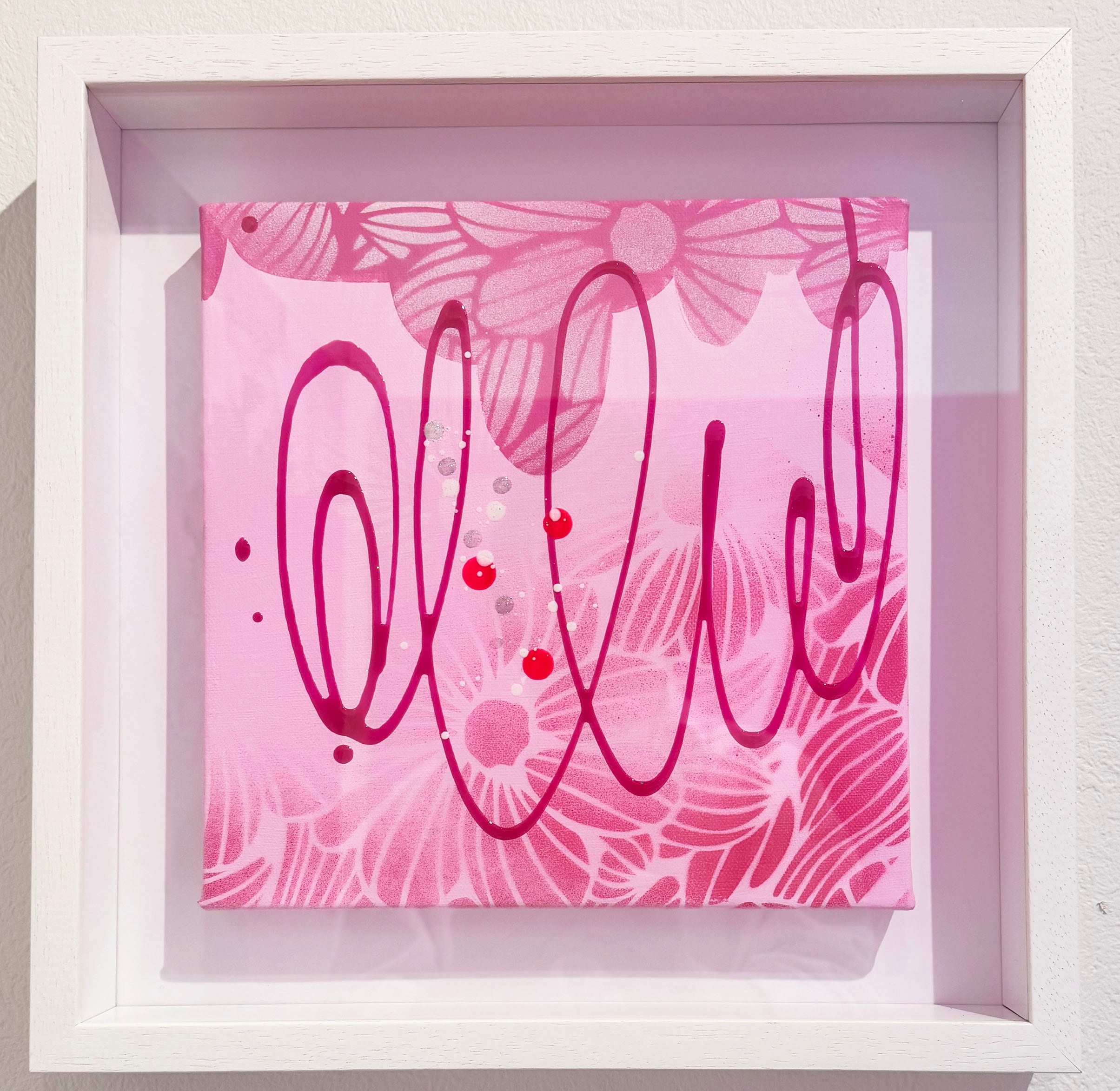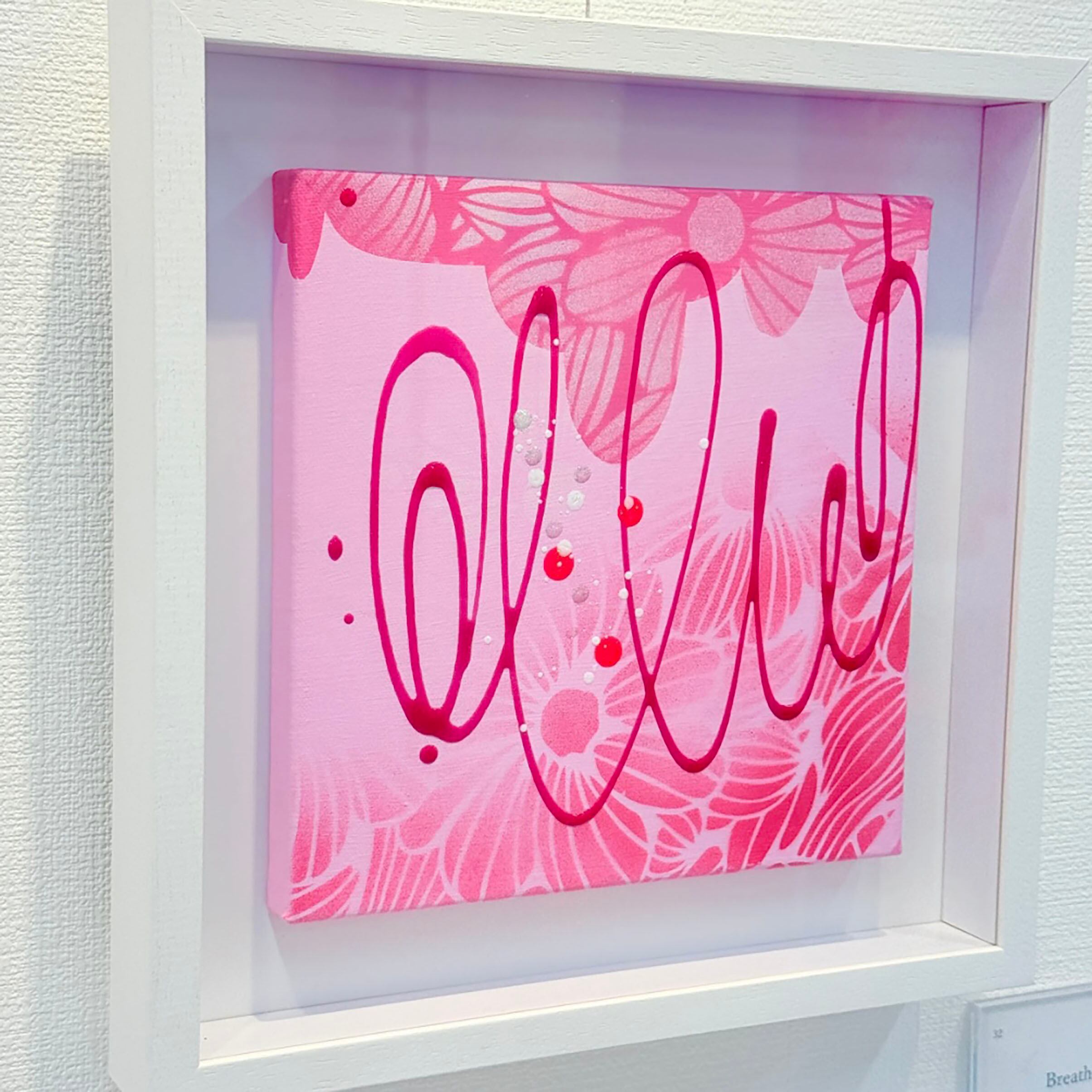 Breathは「呼吸」を意味しています。植物や動物、人、すべての生き物が生きるために大切な「呼吸」という働きを、色と形で表現しました。酸素と二酸化炭素、陽にきらめく水分、他にも。クルクルの線は、それらが何度もくり返されながら命を繋いでゆくことを表しています。…と、頭では考えていましたが、仕上がってみると、何より「かわいい!」。ここが、いちばん見ていただきたいポイントです。キャンバス側面の描画も楽しんでいただけるよう、白いBOX額にセットしてみました。