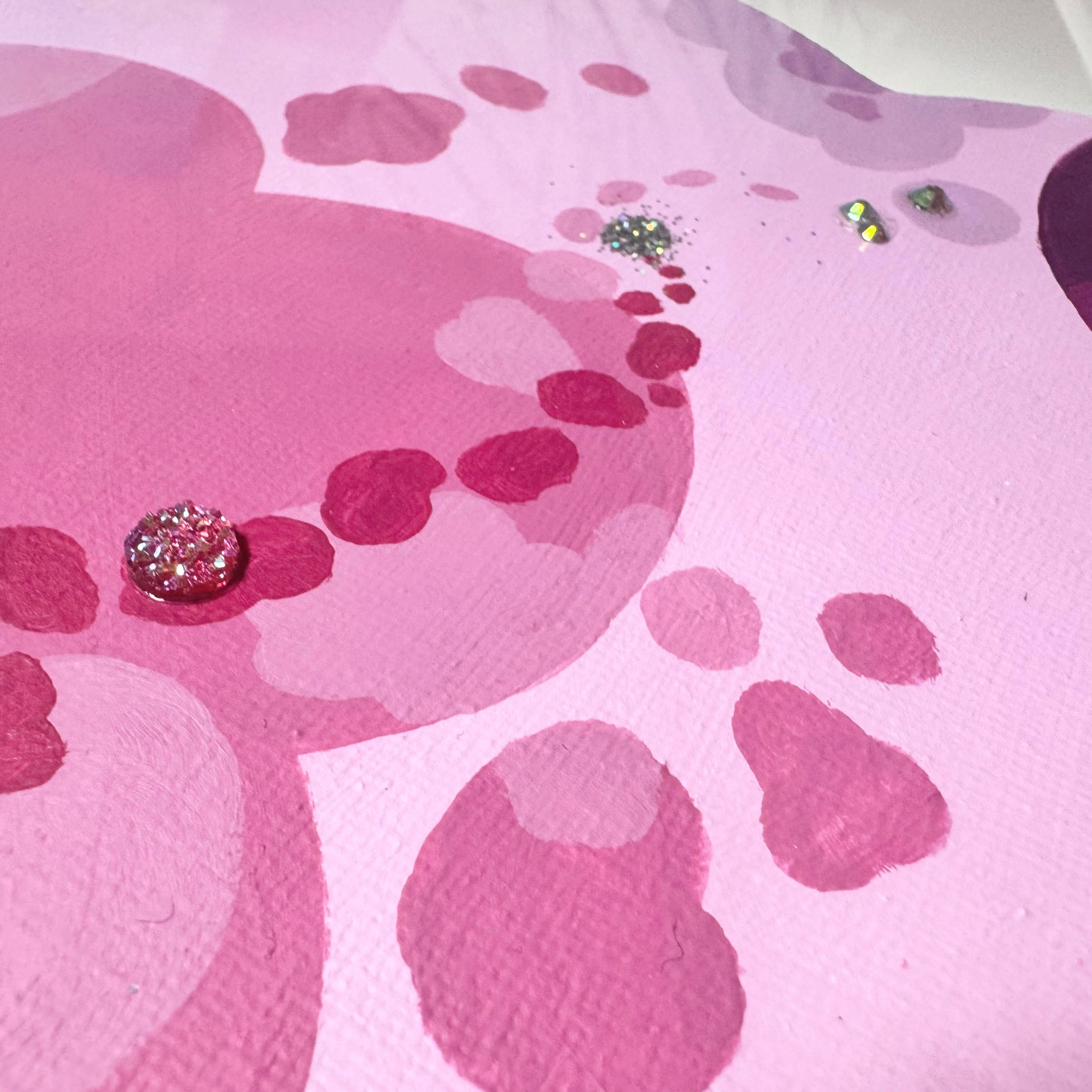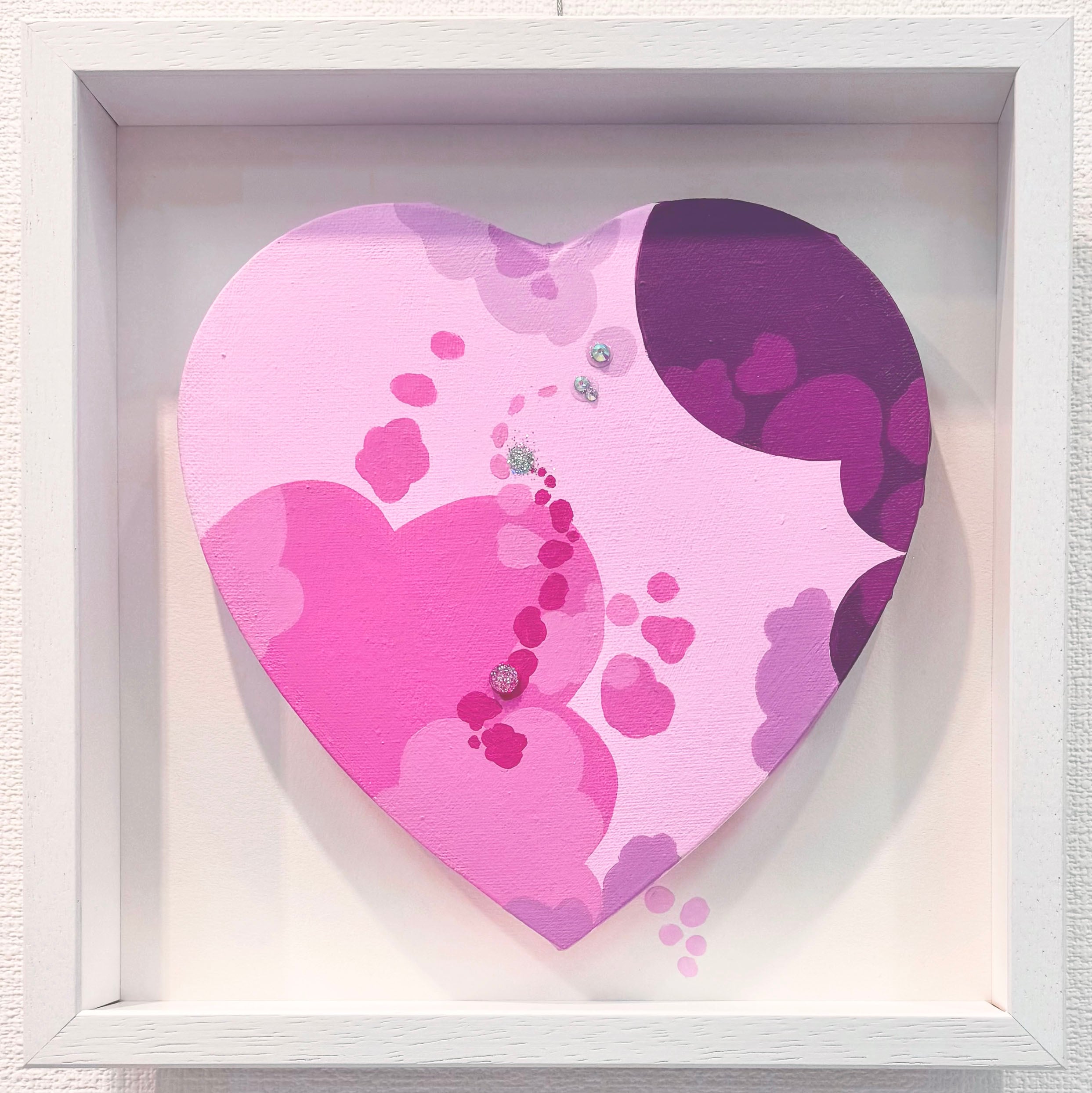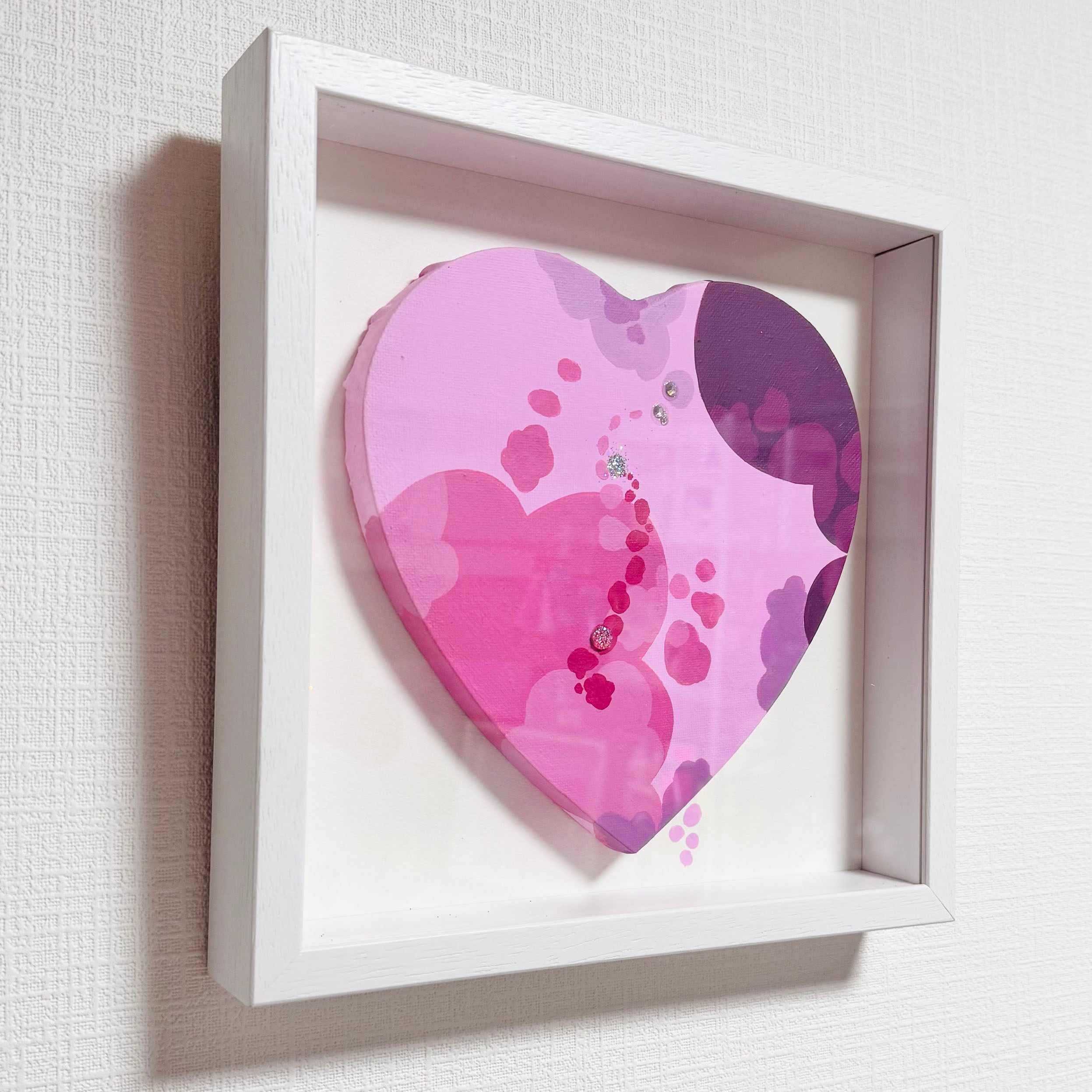 Breath=呼吸をイメージしたシリーズの中の一作で、人気のハート型のキャンバスに描いています。ハートはとても可愛らしい形ですが、実は心臓を表したアイコン。内臓なんですね。そして内臓としての呼吸の入口は肺ですが、この肺も、左右2つ並べて逆さまにすると、なんとなくブレイクしたハートの形に思えてきます。不思議ですね。結果、呼吸とハート型はとても相性がいい、という結論に行き着きました。ま、可愛いからいっかと思っています。キャンバス側面の描画も楽しんでいただけるよう、白いBOX額にセットしてみました。