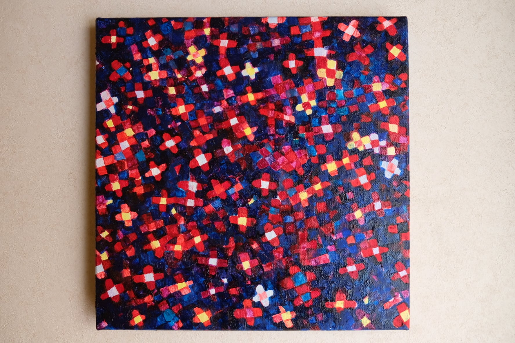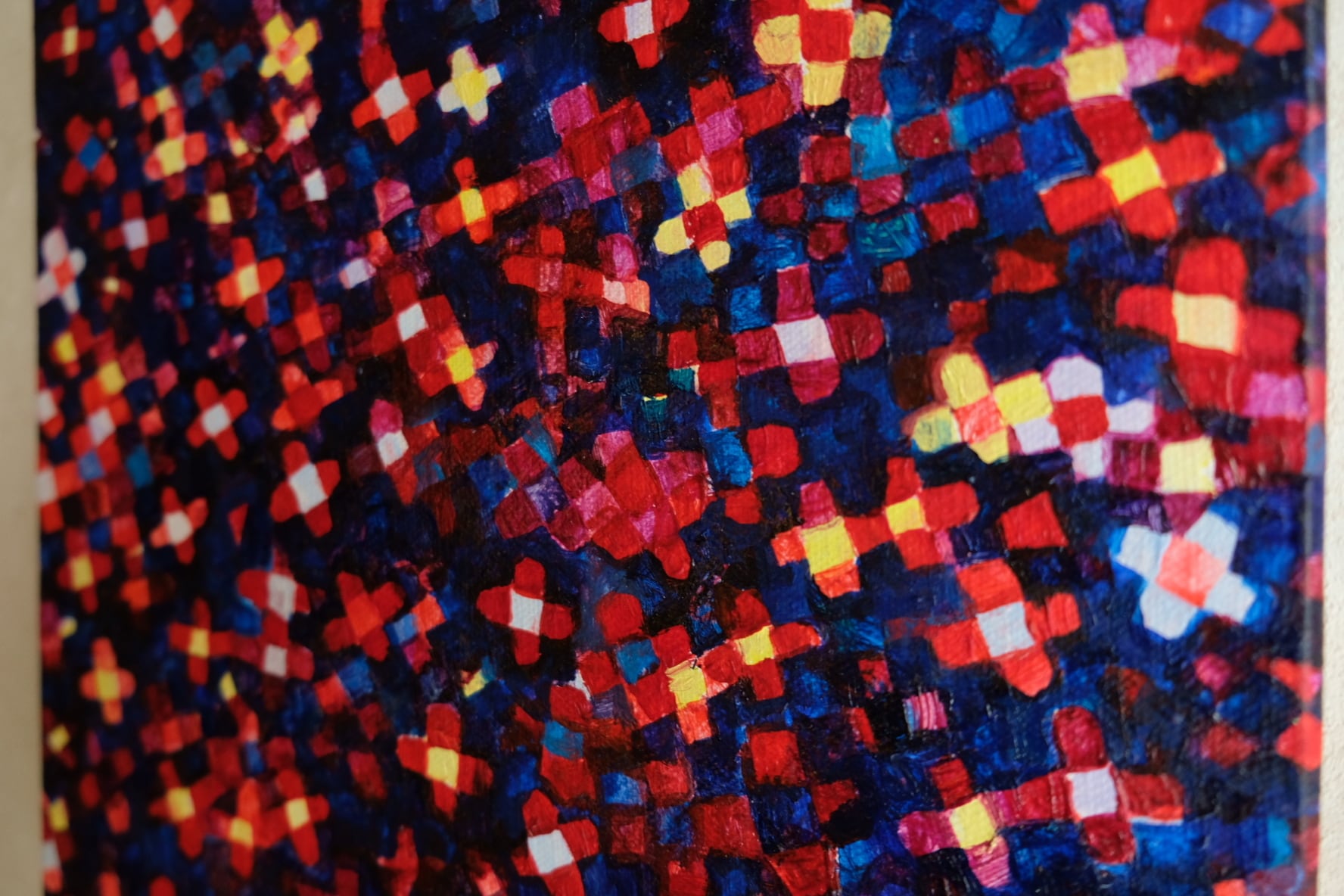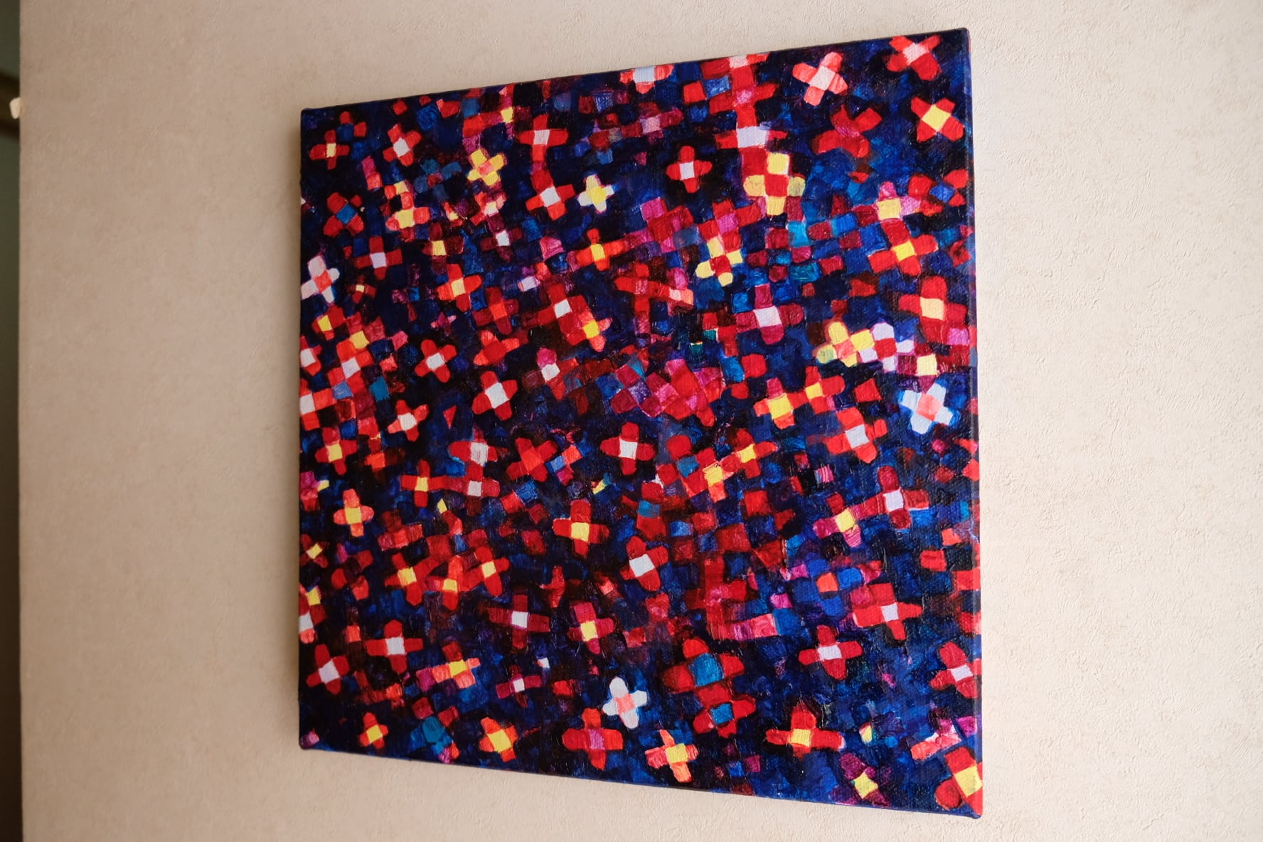 世界の中で自分の存在を問い続けるように、色を重ね、形を重ね、壊し、また立て直す…このプロセスは、まるで自然が内側から枝葉を伸ばし、咲き、枯れ、また芽吹く営みそのものであり、生そのものを映し出す呼吸のような循環なのだ。