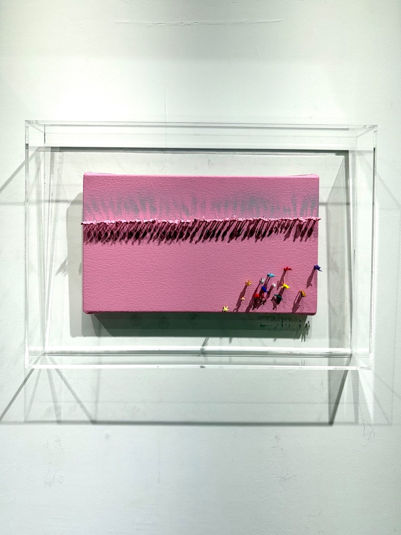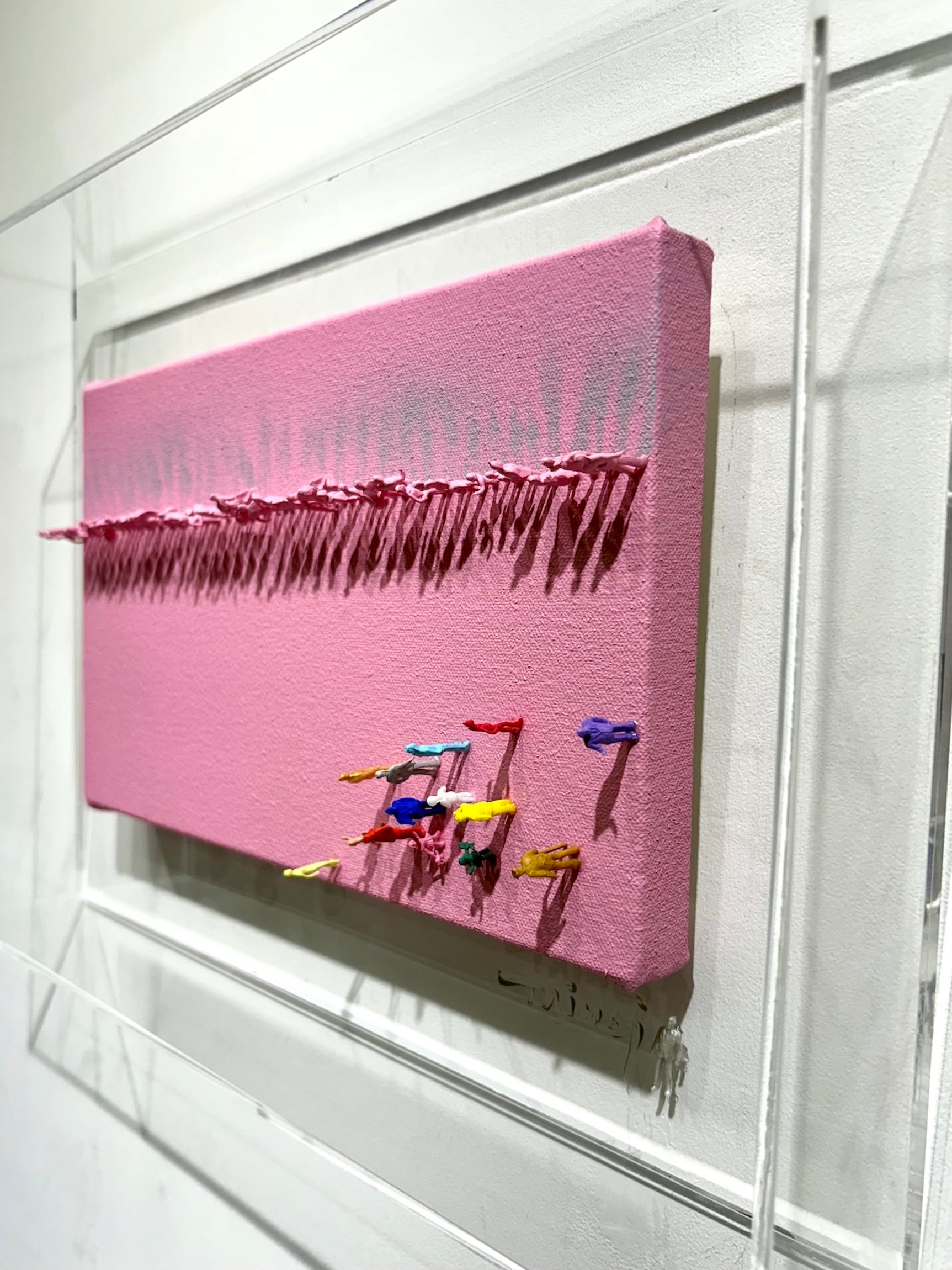 画面上部に並ぶ人々から立ち現れるグレーの影は、歴史の中に刻まれた人々の痕跡を意味している。
