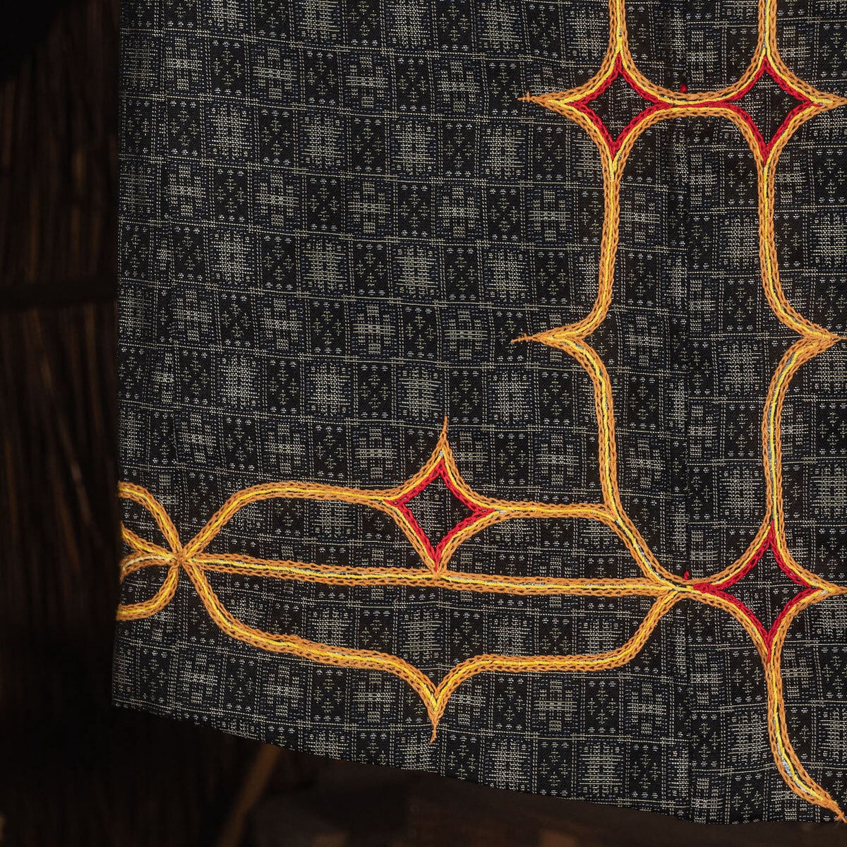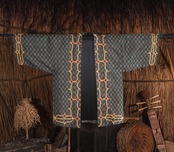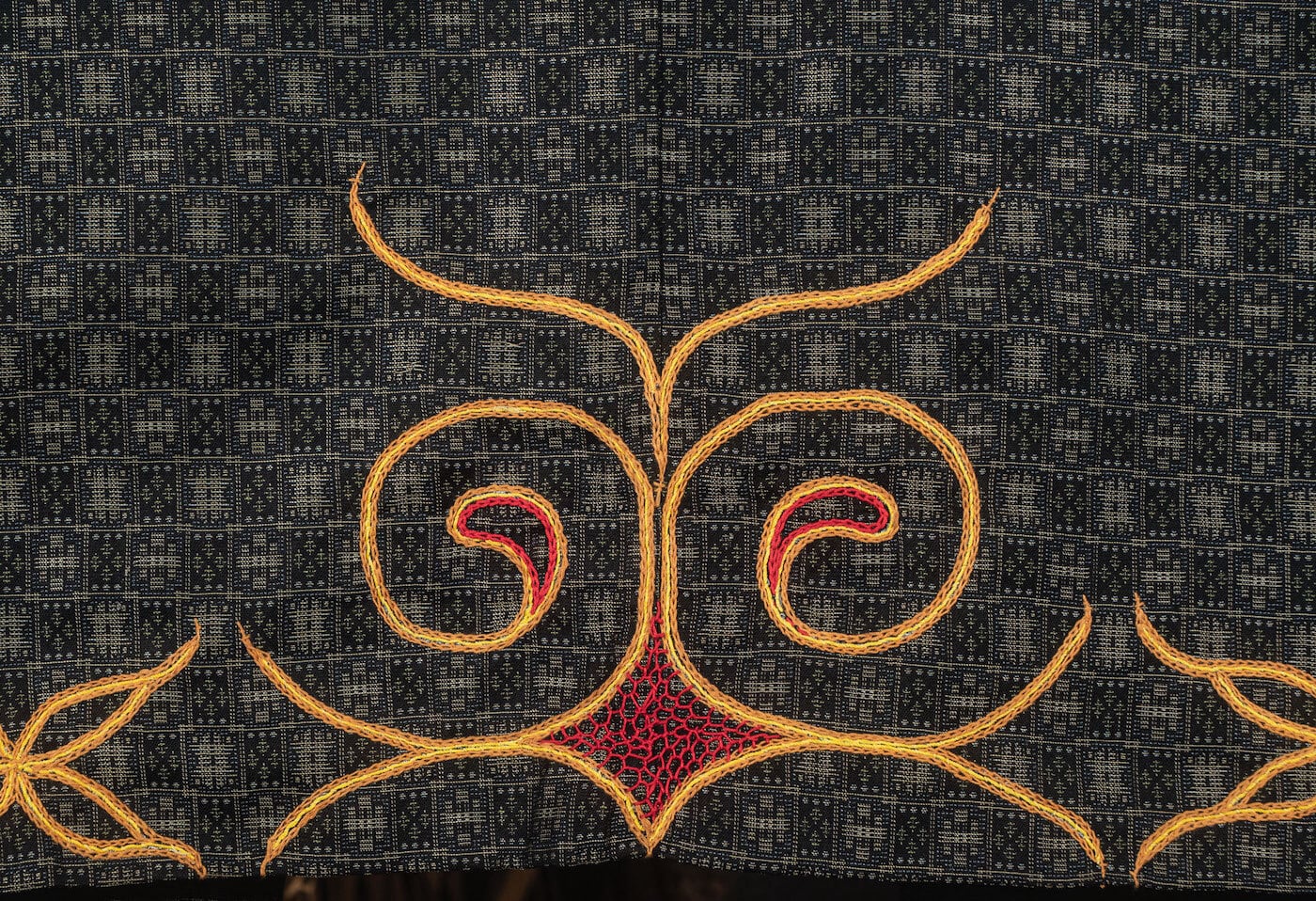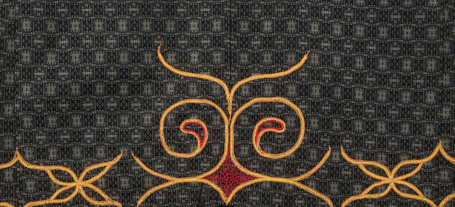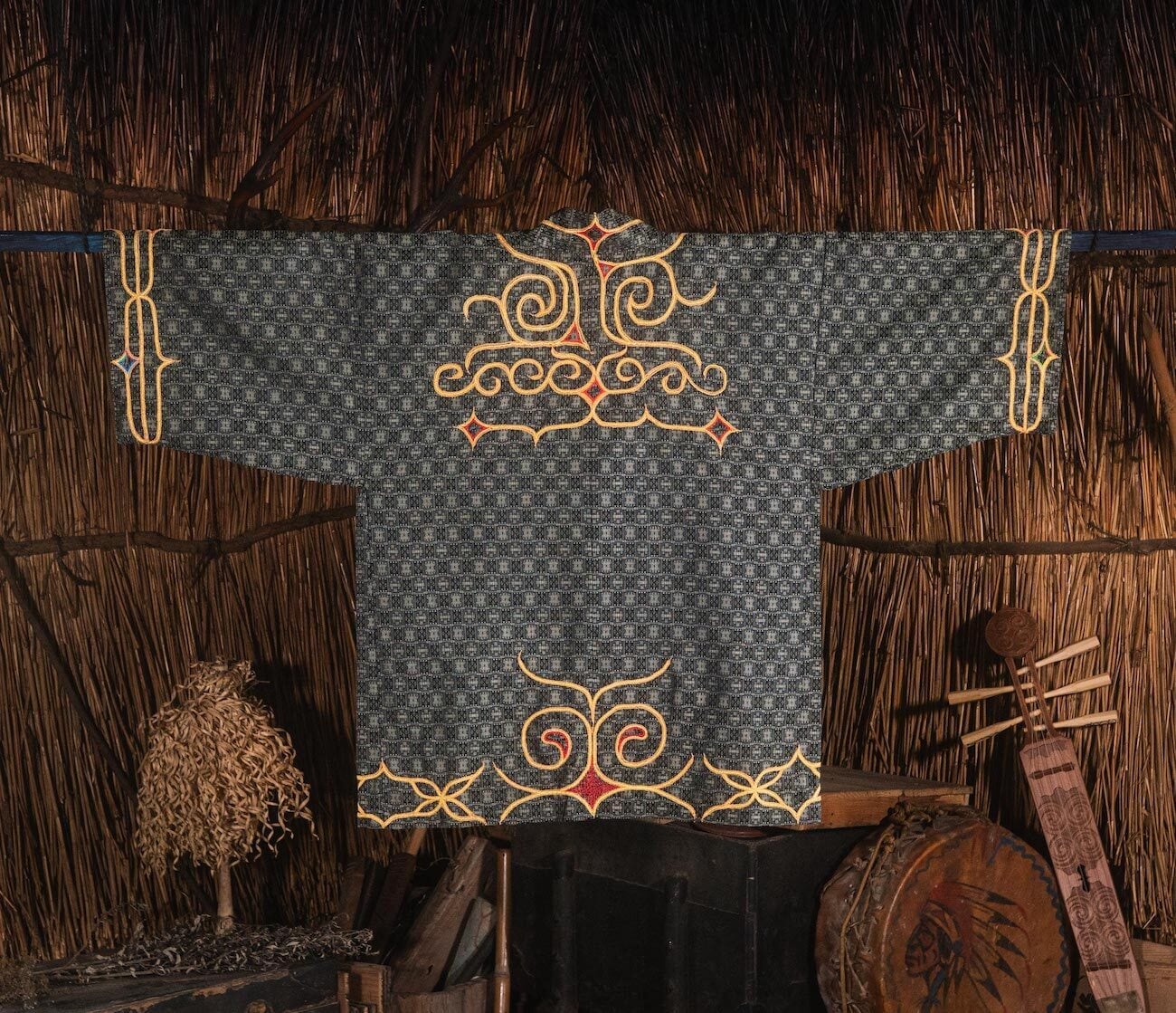 北海道、二風谷を拠点に「沙流川を守る会」「山道アイヌ語・職業訓練校」、37年にわたる「アイノモシリ一万年祭」主宰者、活動家としてアイノ精神文化や先住民の権利、自然環境を護る様々な活動や祈りの儀式であるカムイノミをされ、ビッグマザーでありトゥスクルでもあるアイヌ民族の高名なフチ(高齢の女性に対する尊称)、アシリ・レラ氏による平取地方の手法によるチヂリ(アイノ民族の伝統的な木綿の刺繍紋様の着物)を儀式の時の晴れ着として制作した半纏の作品です。