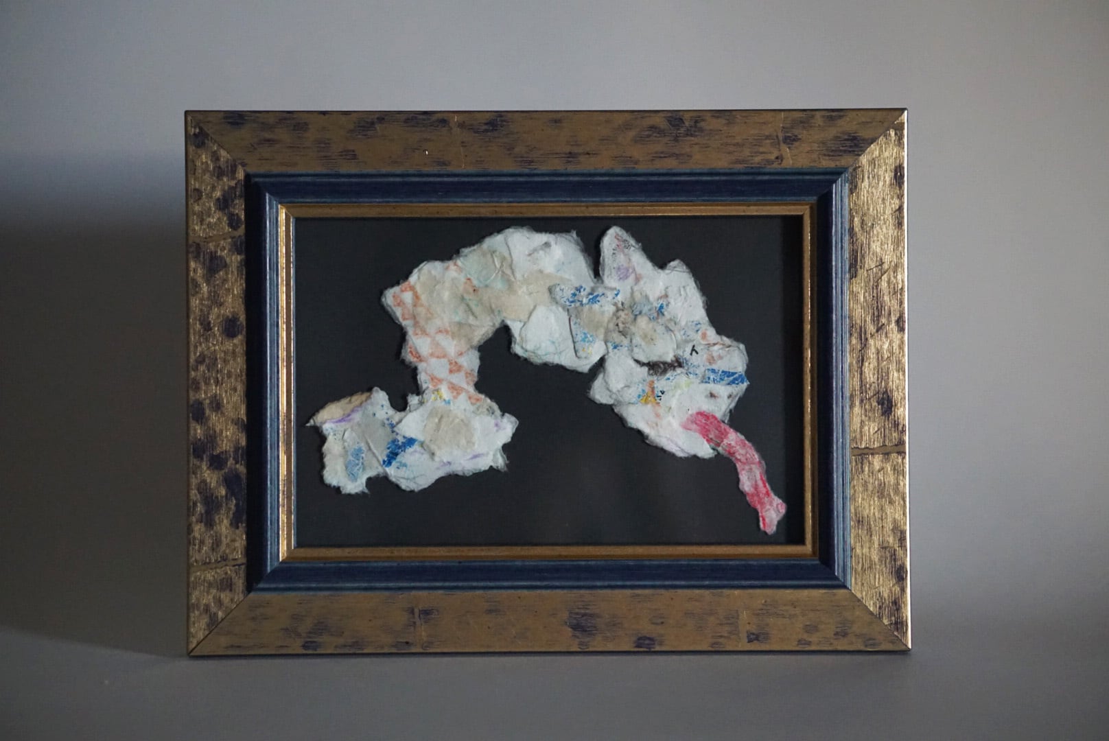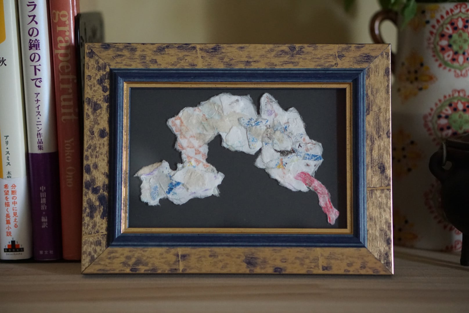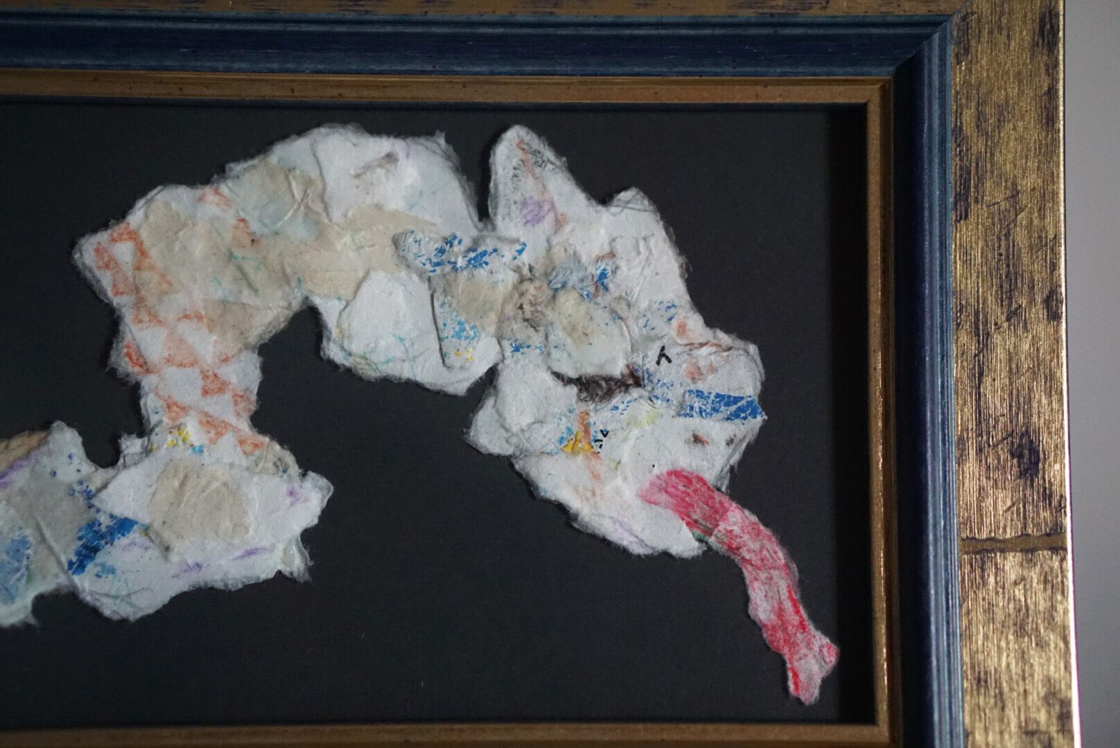 メディア:色ペン、色鉛筆、クレヨン、糸、でんぷん糊、リサイクル牛乳パック紙、額(color pen, color pencil, crayon, thread, starch glue on Recycled milk cartons, flame)