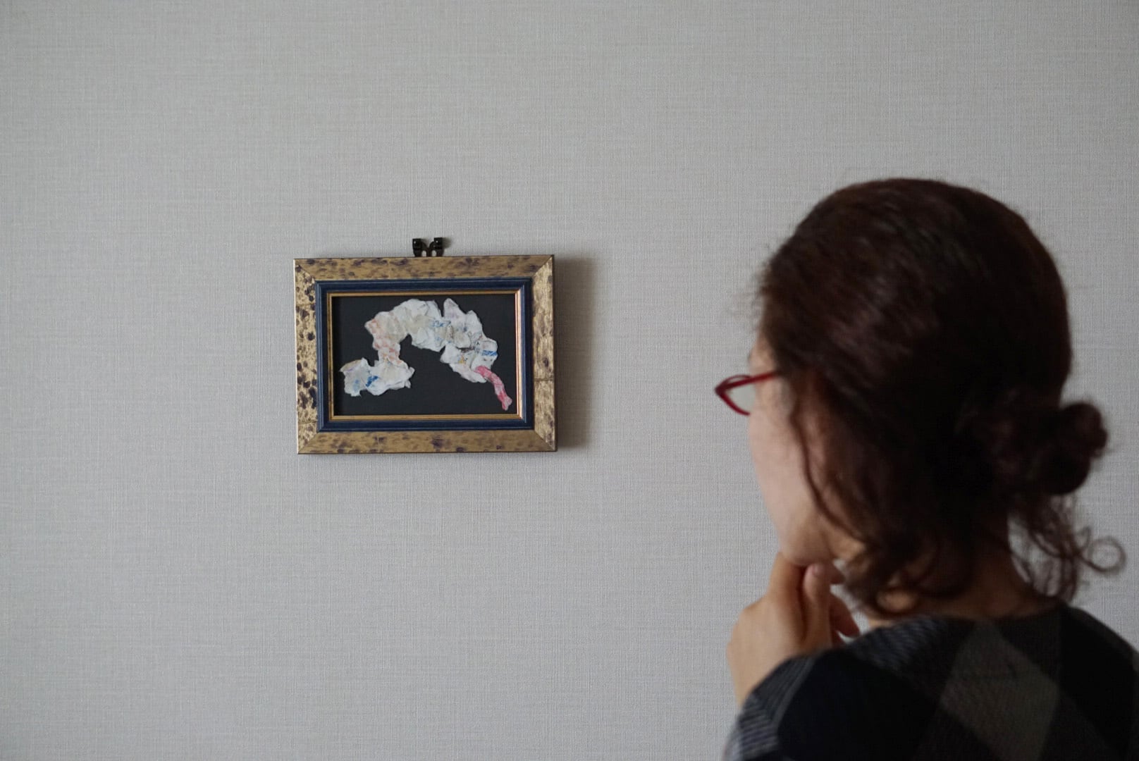 (素材選びは、リサイクルミルクカートン(牛乳パック)を使うシリーズ“Milk carton series”に依拠しており、生活の中にある素材を芸術へと昇華した作品となっています。)