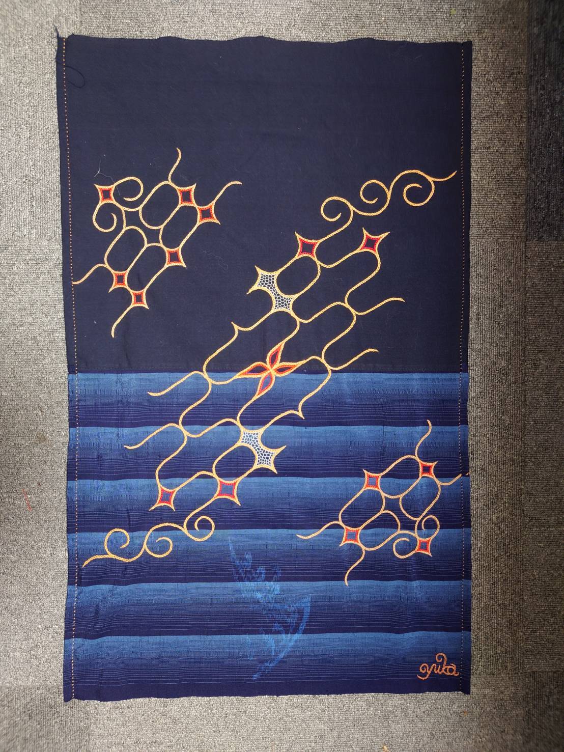 幼いころから見てきた母の背中、いつも文様がそばにあったことを思い出したとき、ひらめいたその文様は母が描いていた文様によく似ている。母から生まれる文様の世界は受け継がれていく。
