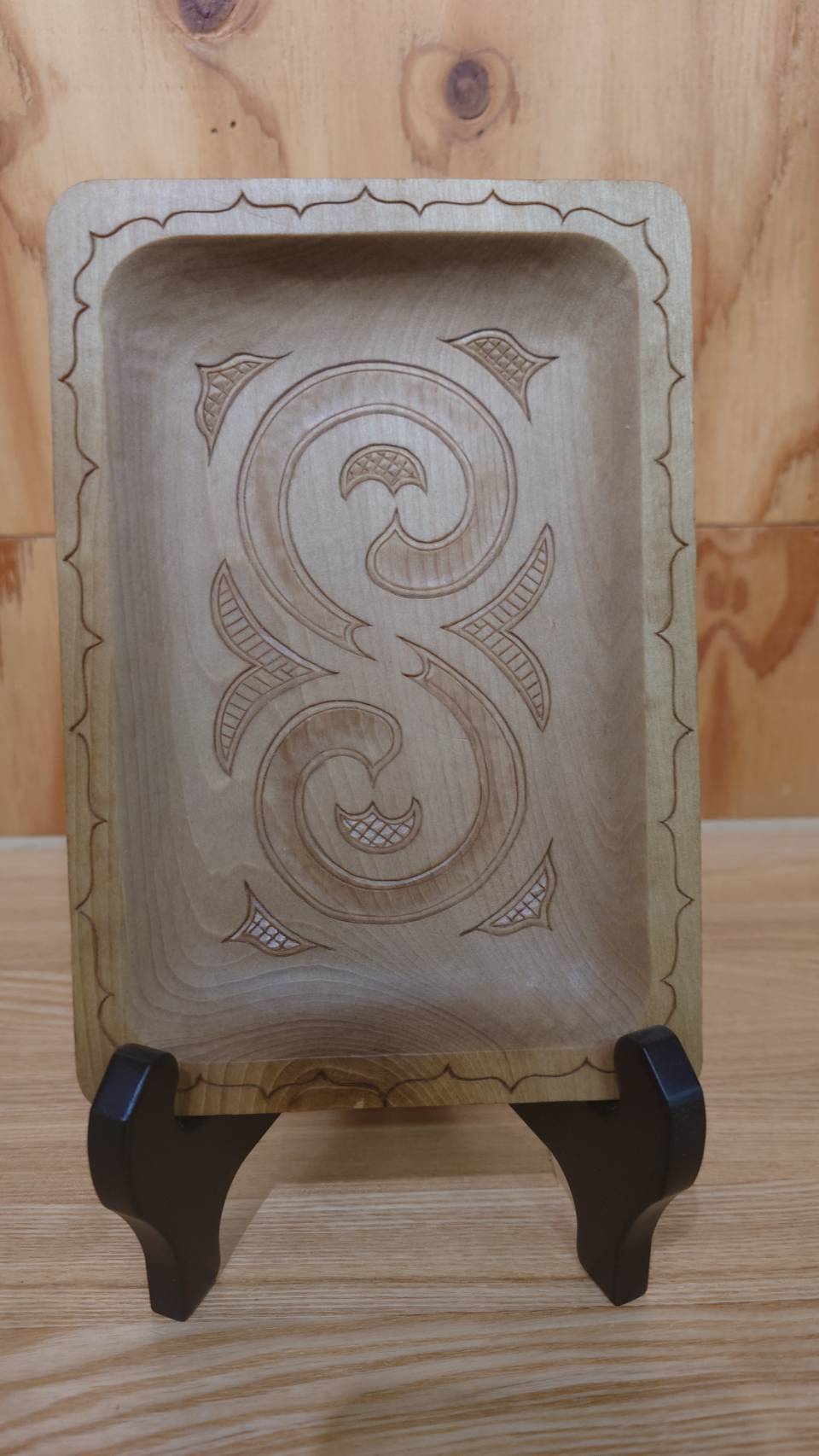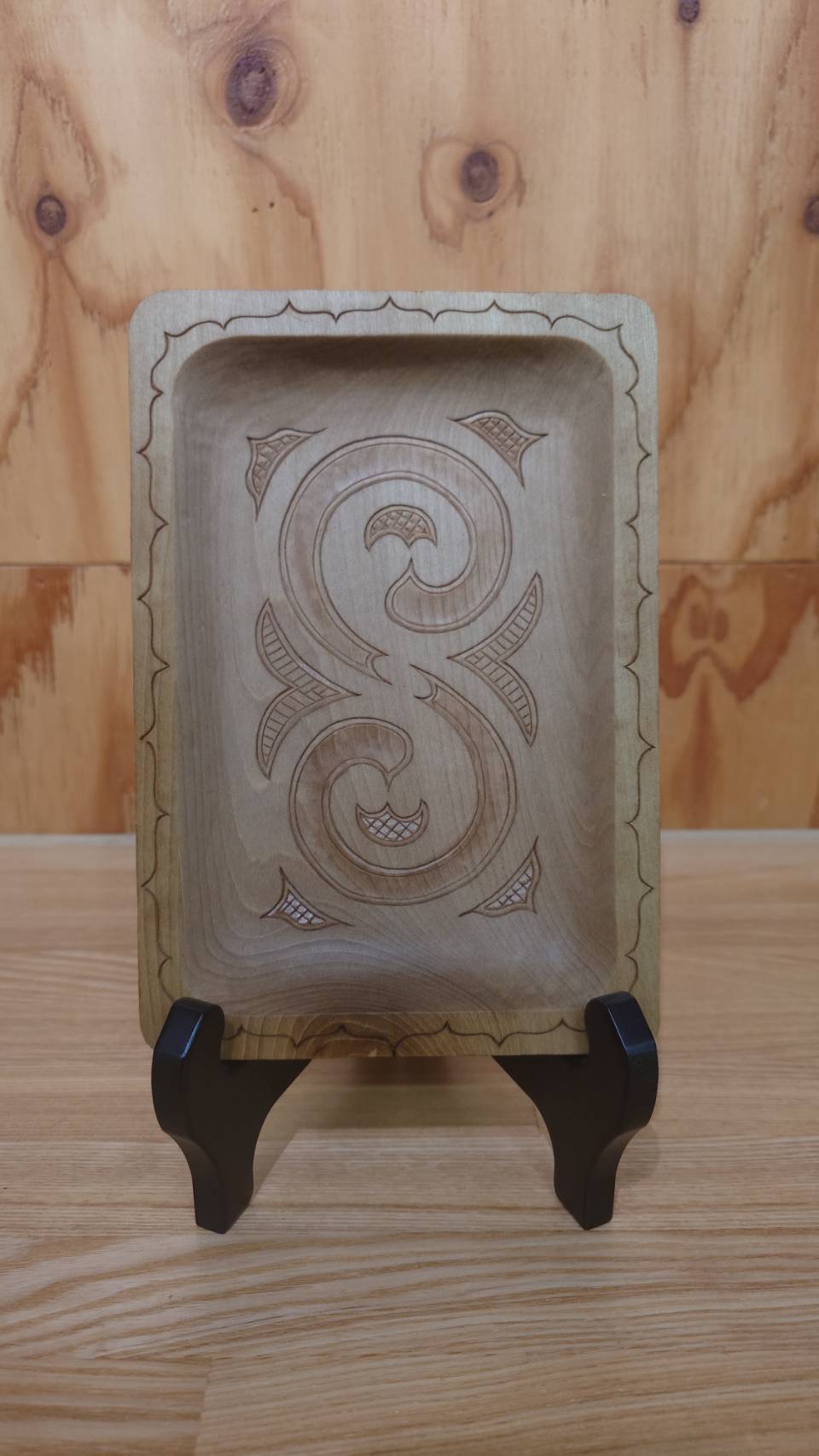 アイヌの伝統工芸品の一つでもある「イタ」です。「morew(モレウ)」は「渦」を意味するアイヌ語です。アイヌの木彫の基本文様であるmorewを丁寧に施しています。私たちrakesにとってこのアートフェアが初の展示ということで、初心に帰るという意味も込め、基本に忠実に作った作品です。