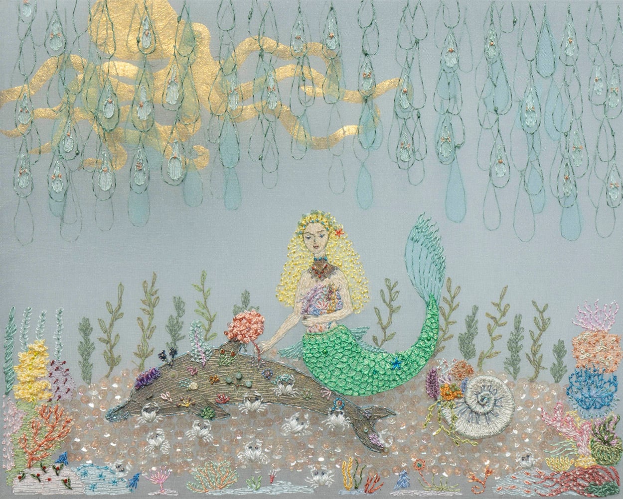 マダコの卵は海藤花と呼ばれる美しい花のようなかたまり。タコの赤ちゃんはそろそろ孵化しそう。死んだイルカを深海カニが食べていて、人魚は死骸に海の花を植えているところ。海の中の「生と死」と「食物連鎖」を、浮遊する刺繍を使って幻想的に描きました。