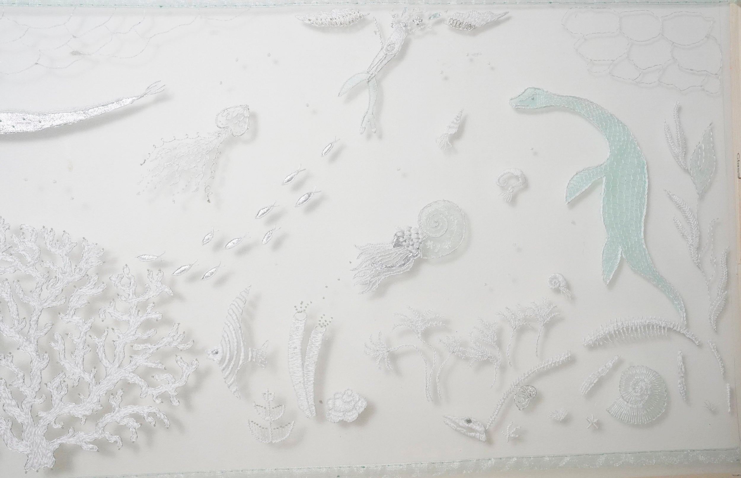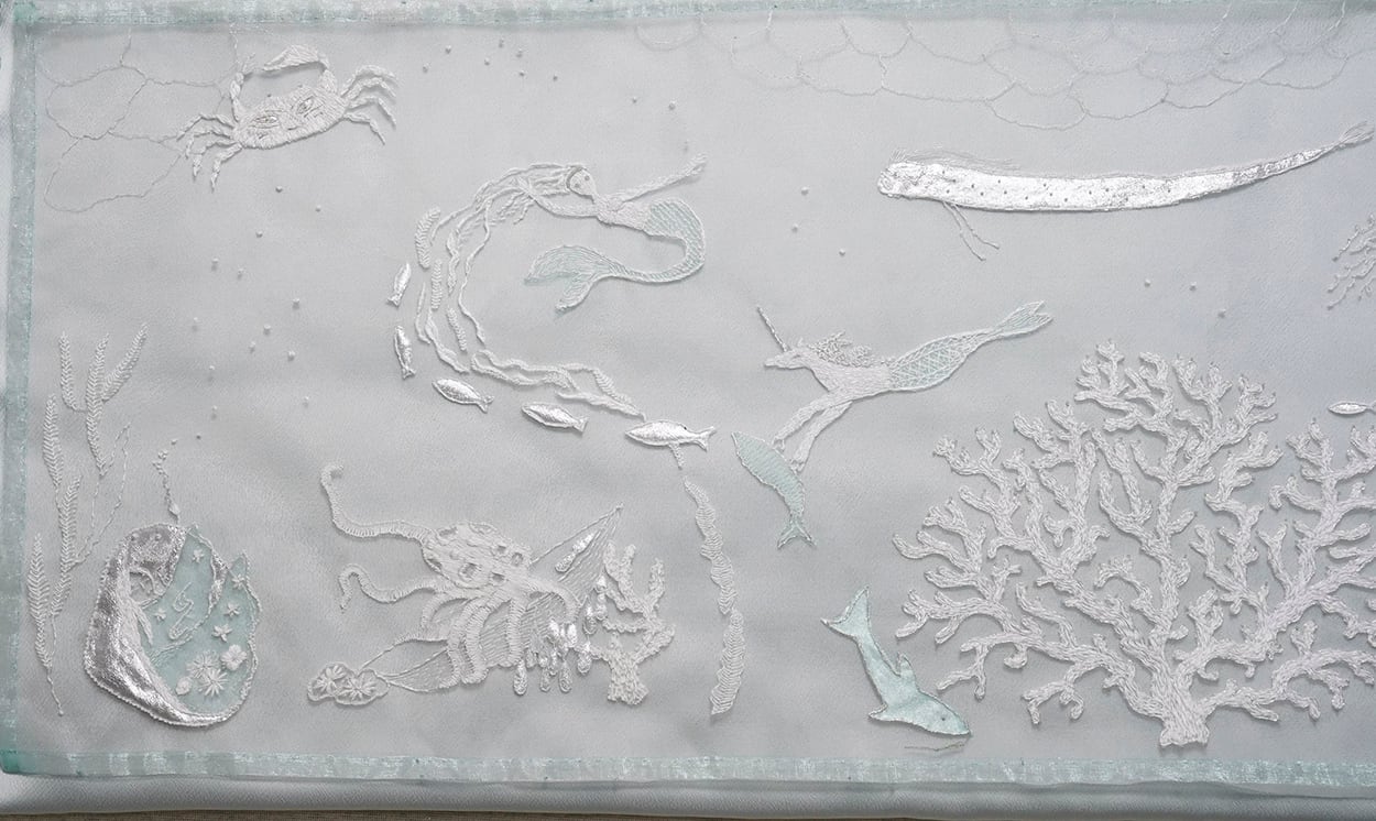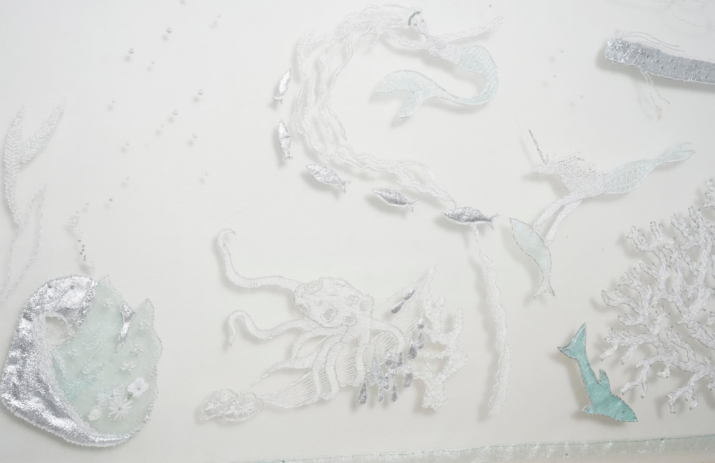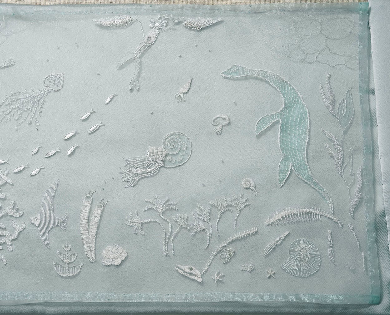 見つからない化石は、存在しない証拠にならない。海には、まだ名も知らぬ、想像もできない生き物たちが潜んでいる。この作品は、そんな未決の生き物たちを刺繍で形にしたものです。