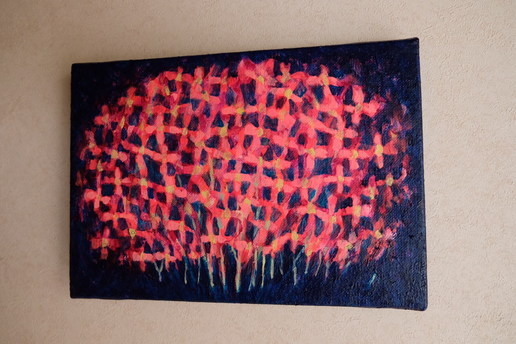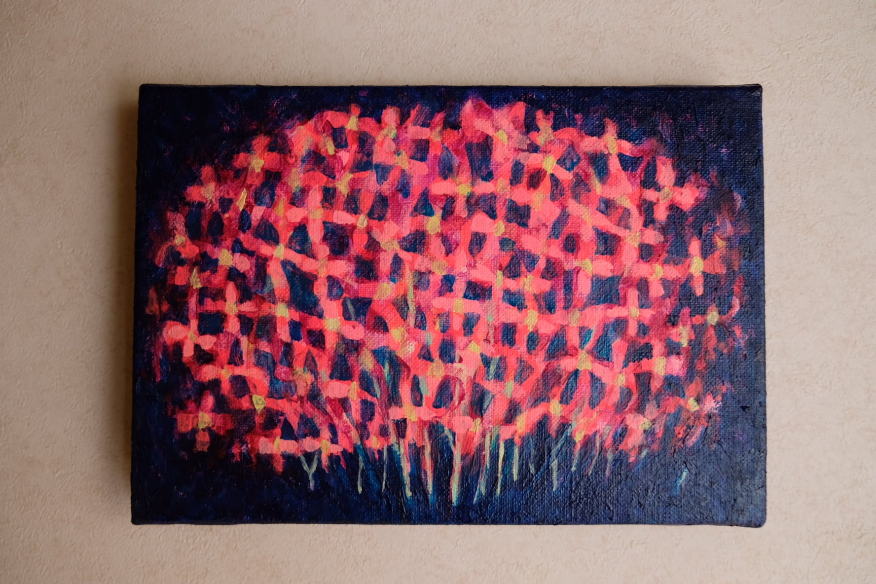 世界の中で自分の存在を問い続けるように、色を重ね、形を重ね、壊し、また立て直す…このプロセスは、まるで自然が内側から枝葉を伸ばし、咲き、枯れ、また芽吹く営みそのものであり、生そのものを映し出す呼吸のような循環なのだ。