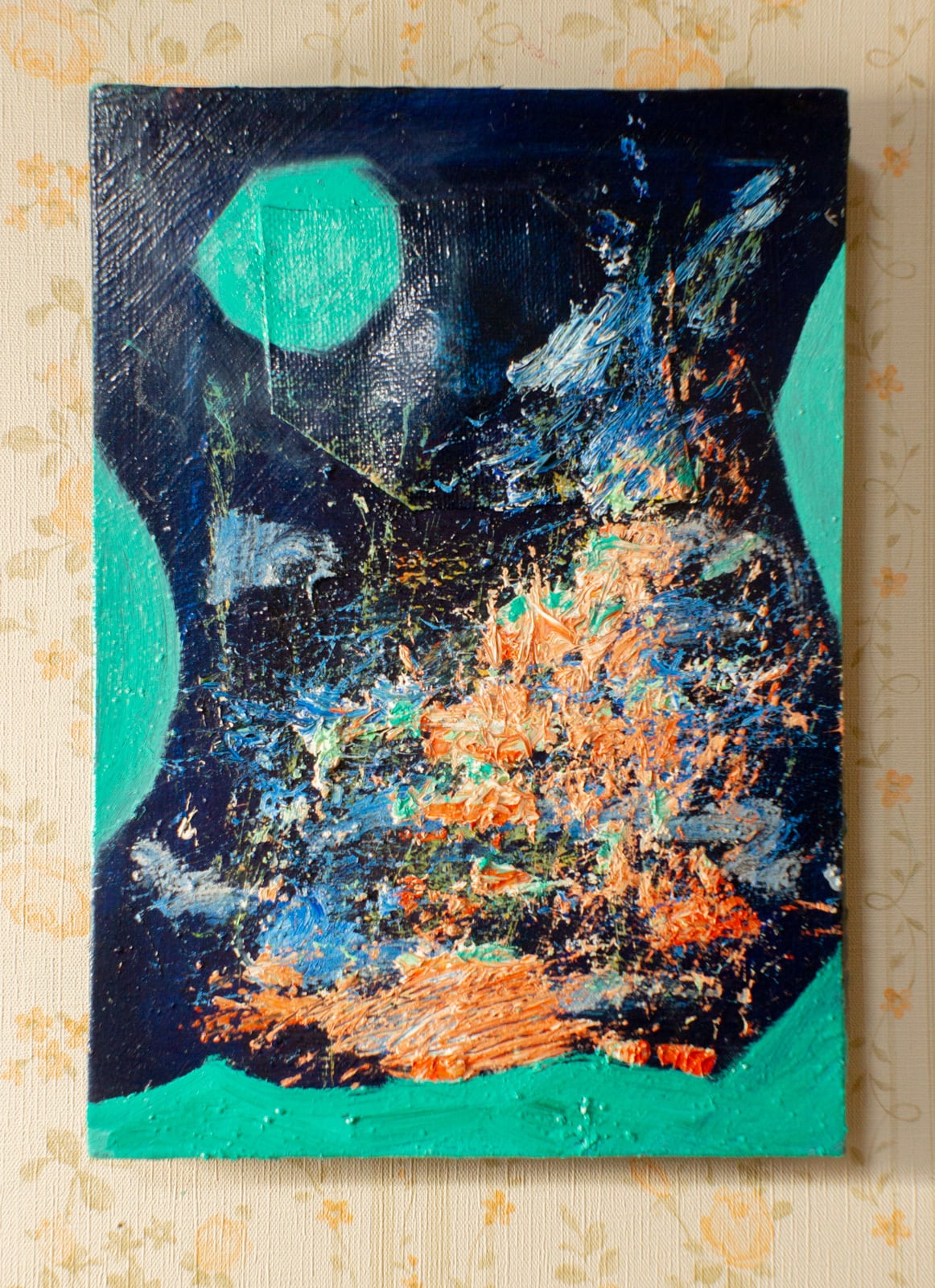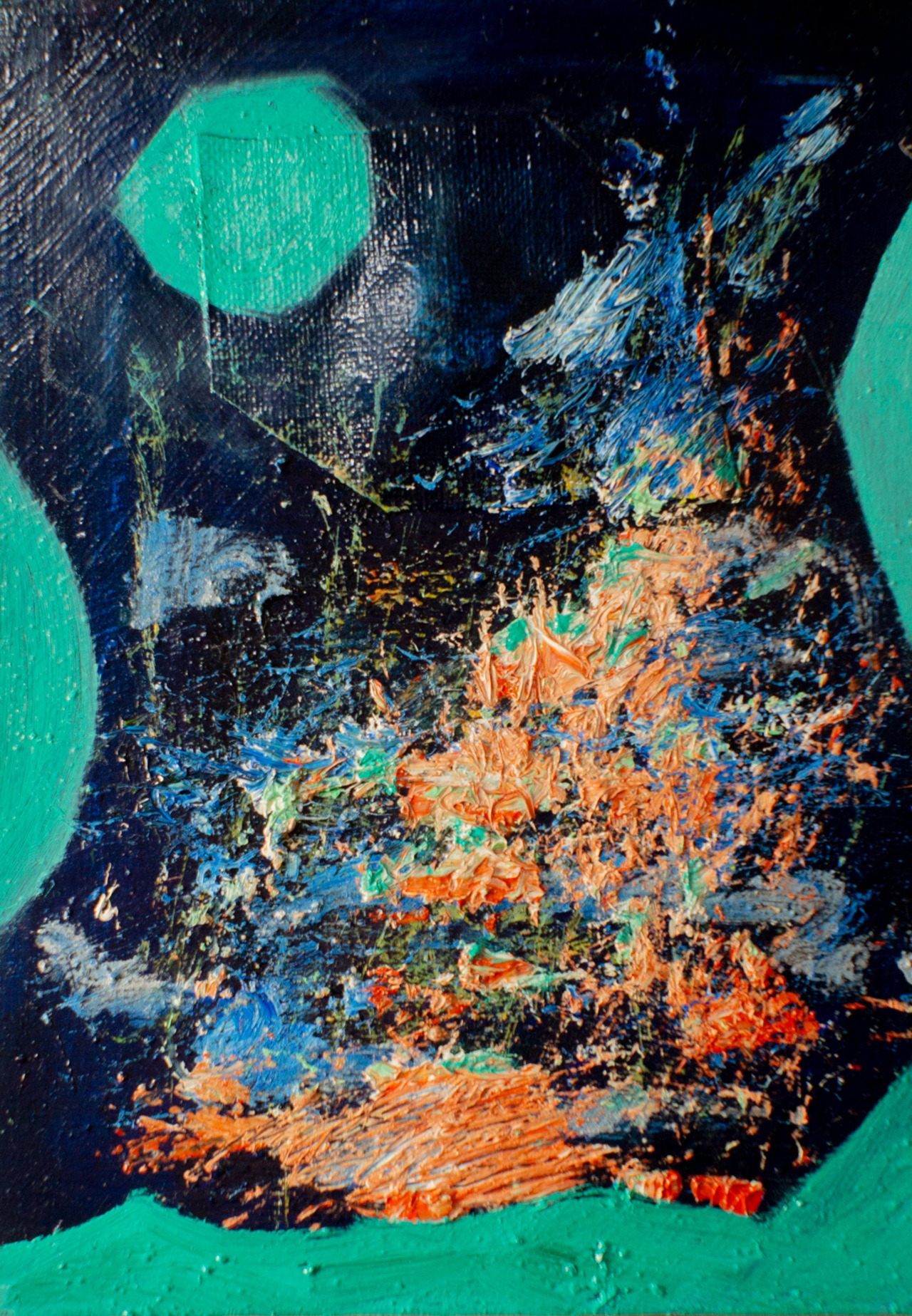 海をおおう、真っ青な夜を描いた。幻のように緑色の太陽が夜空に現れている。鳥の羽を使って作品の一部を描いた。麻布を支持体の一部に貼り付けている。麻布の下には砂を埋めた。