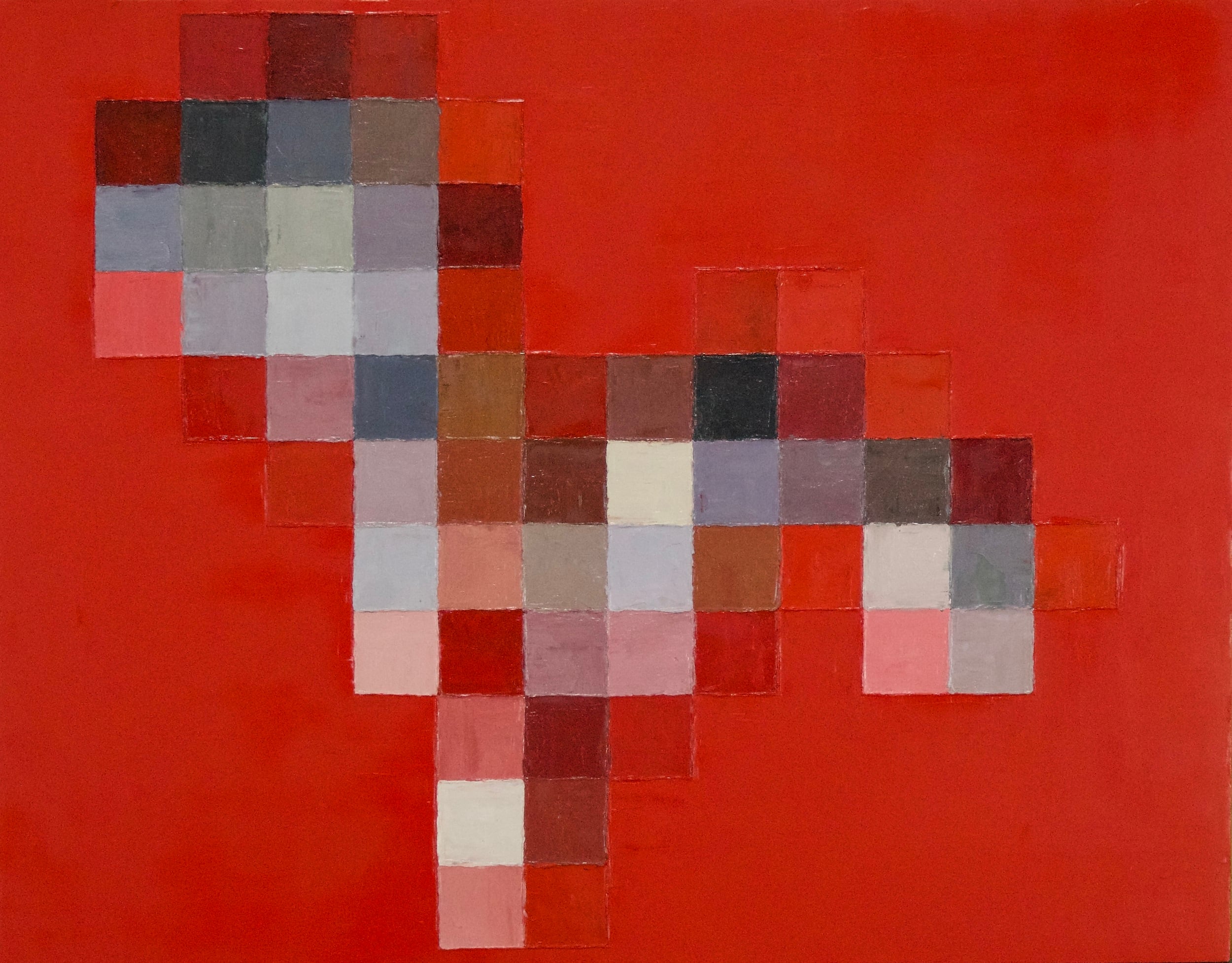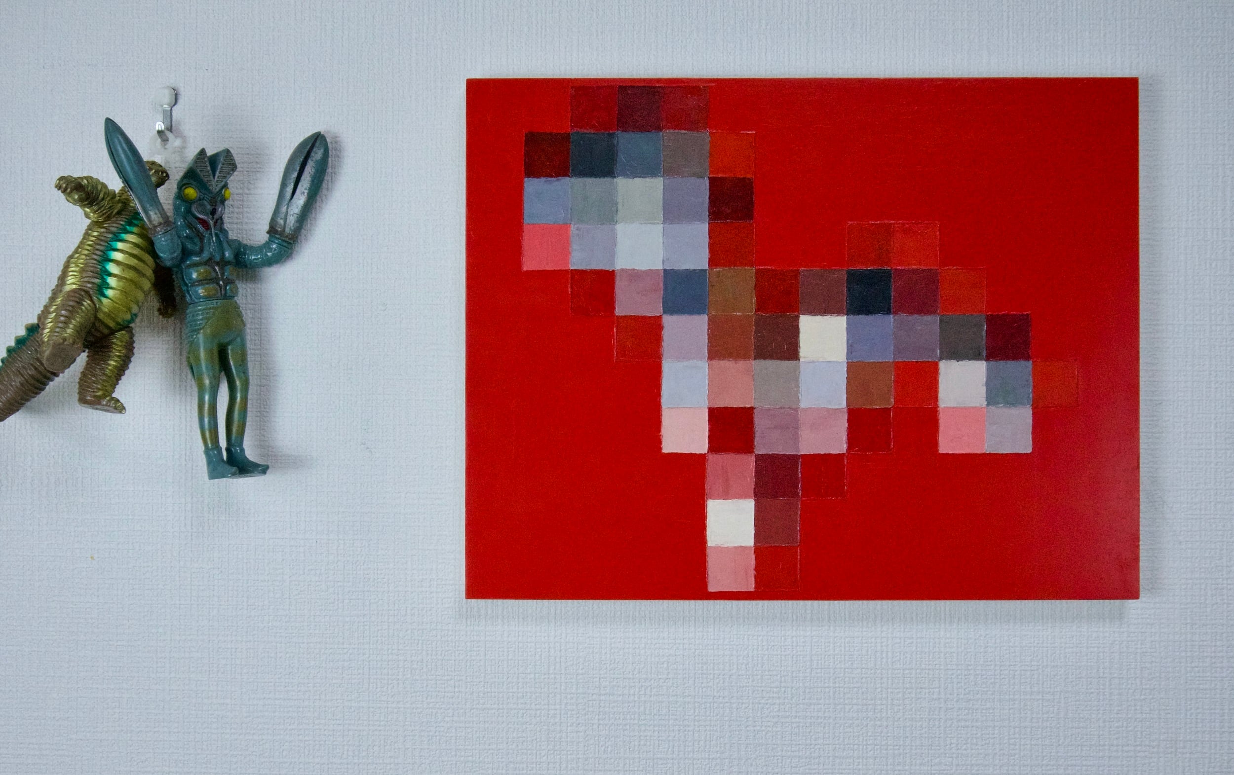この作品は一見四角形で構成された抽象画。しかしこの作品を遠くから見ると、薄目で見ると、スマホで写真に撮ろうとすると、別の何かが見えてくるかもしれません。一度それが見えてしまうと、もうこの絵はそれにしか見えなくなってしまいます。しかしあなたが実際に見ているのはただの四角形です。目の前にある事象と、それに対してあなたの脳が見ようとしているものは違っているかもしれないということを可視化した作品です。