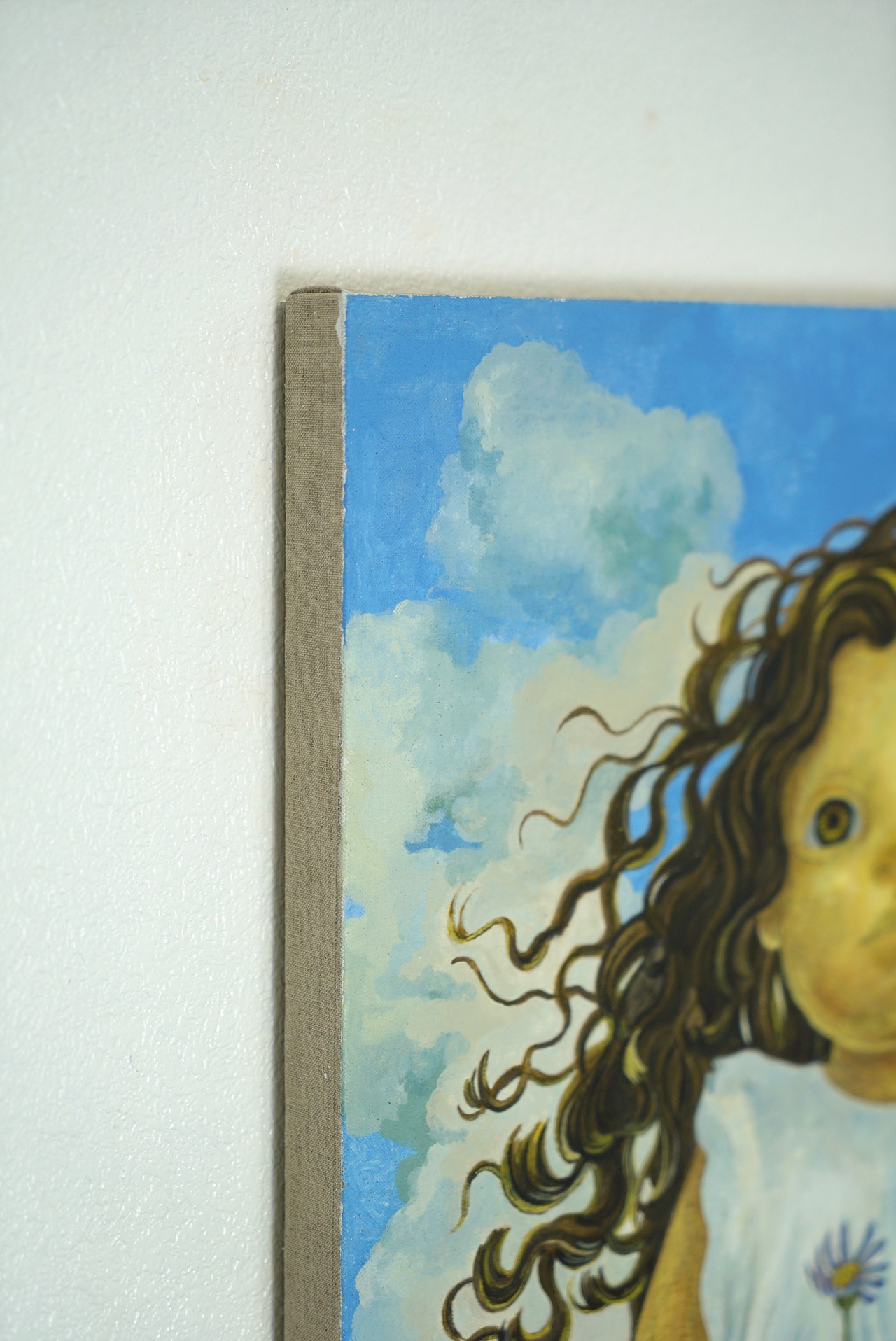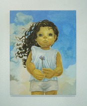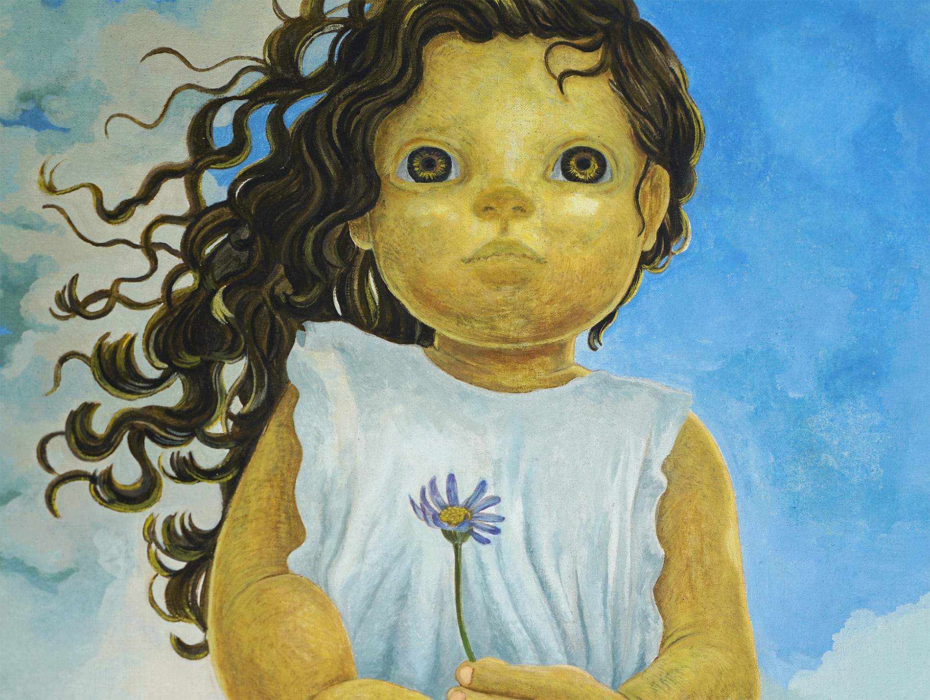 「Gift」シリーズは最初にモチーフとなる花を選び、次にそれを持つにふさわしい様相の子どもを描き、最後にその子どもがその花を第三者にプレゼントするに相応しい景色を描きました。いつも気紛れに描き始めるのですが、花を描く時は必ず花屋に出向き描きたいものを選びます。以前来た時は見向きもしなかった花が今日は魅力的に見えることもしばしばです。天気や温度、湿度、対象を取り囲む風景などの外的要因に左右されるのではと考えております。モチーフにする花を選定した後は、その色や形から「子ども」の大まかなイメージをつくり、細かい様相をつくり、構図を決めて画面を構成していきます。「gift」や「present」といった言葉をキーワードに、大切な人へ贈るための花を持つ子どもを描きました。この子どもは昼下がりの晴天のもと、ブルーデージーを持っています。