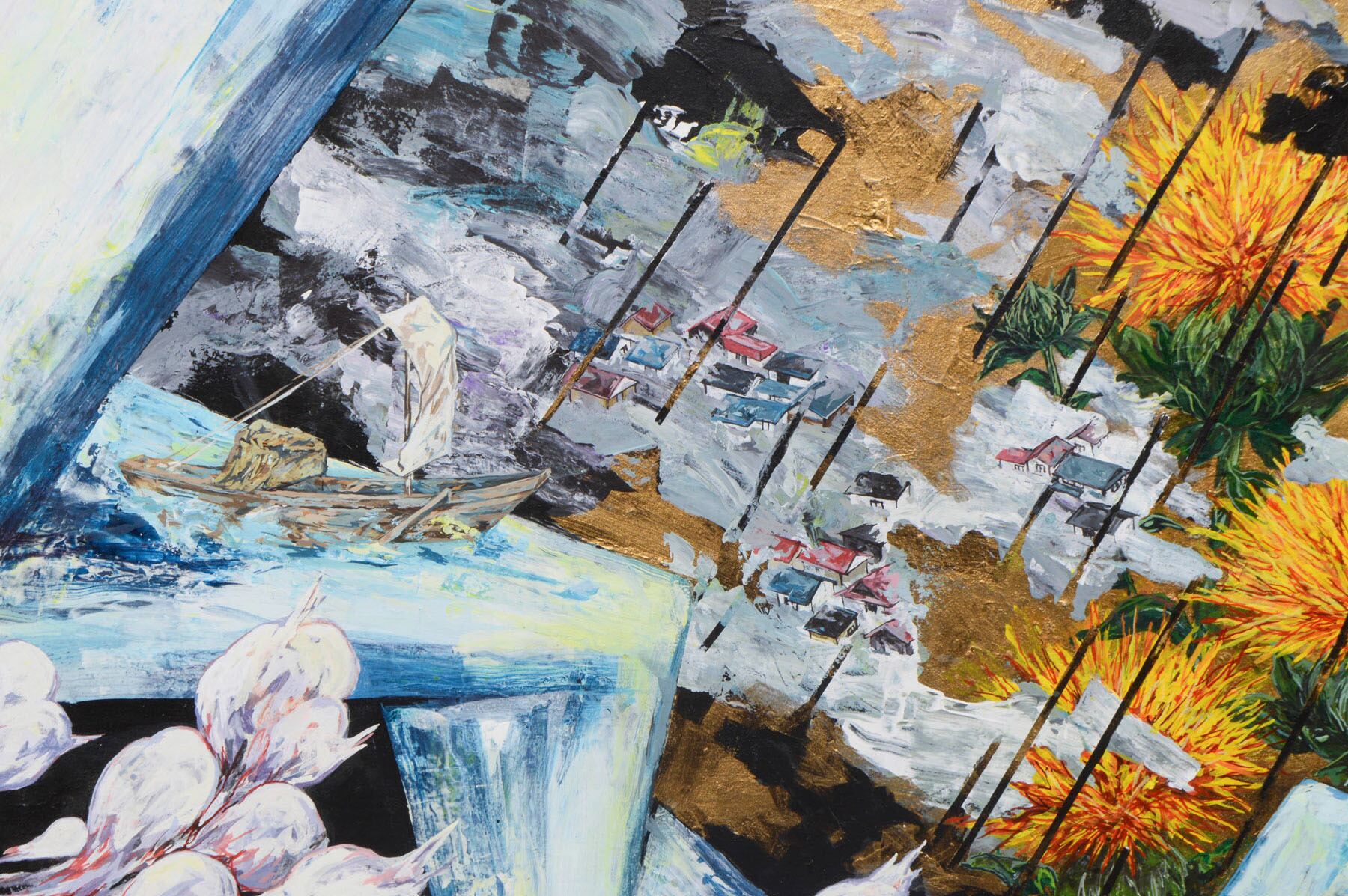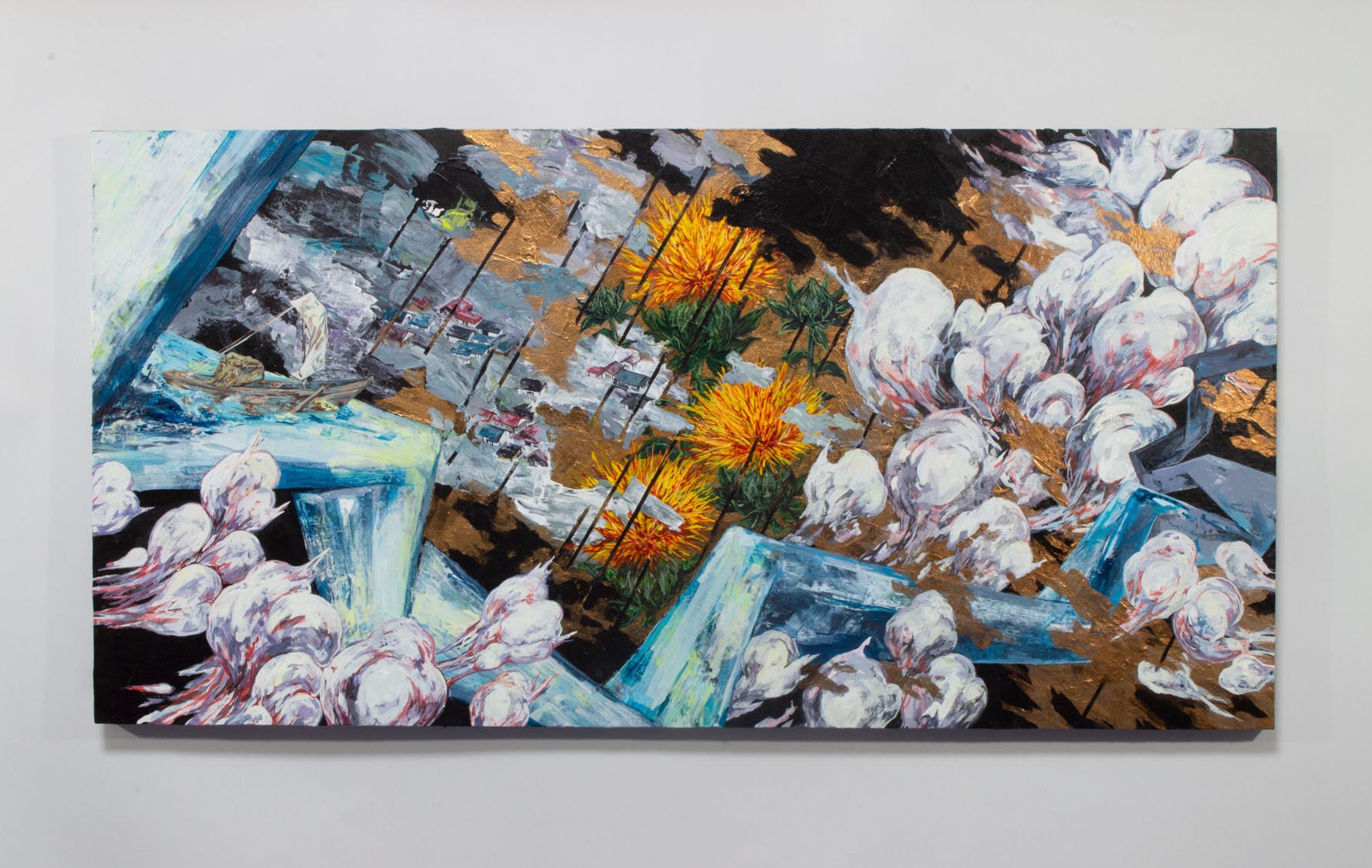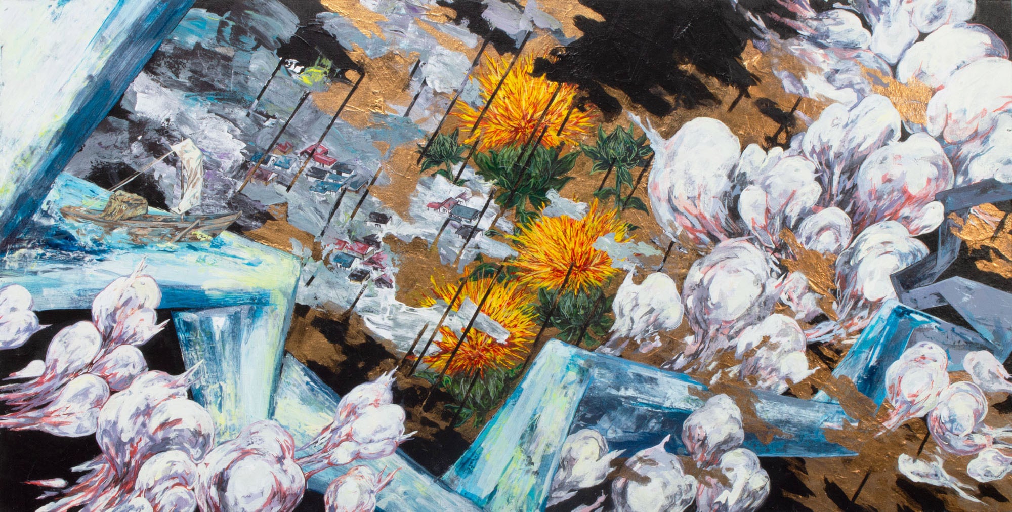 私は山形県で生まれ、山形県で育ちました。わが県を代表する河川が最上川で、「母なる川」と呼ばれています。江戸時代、最上川舟運によって山形と上方(大阪)がつながり、流域に文化と富をもたらしました。その象徴の1つが、この作品に描かれている紅花です。しかし最上川は同時に水害をもたらす存在でもあり、毎年のように氾濫を繰り返しています。先人は洪水のたびに土地を耕し直し、またそこに暮らしを築いてきました。