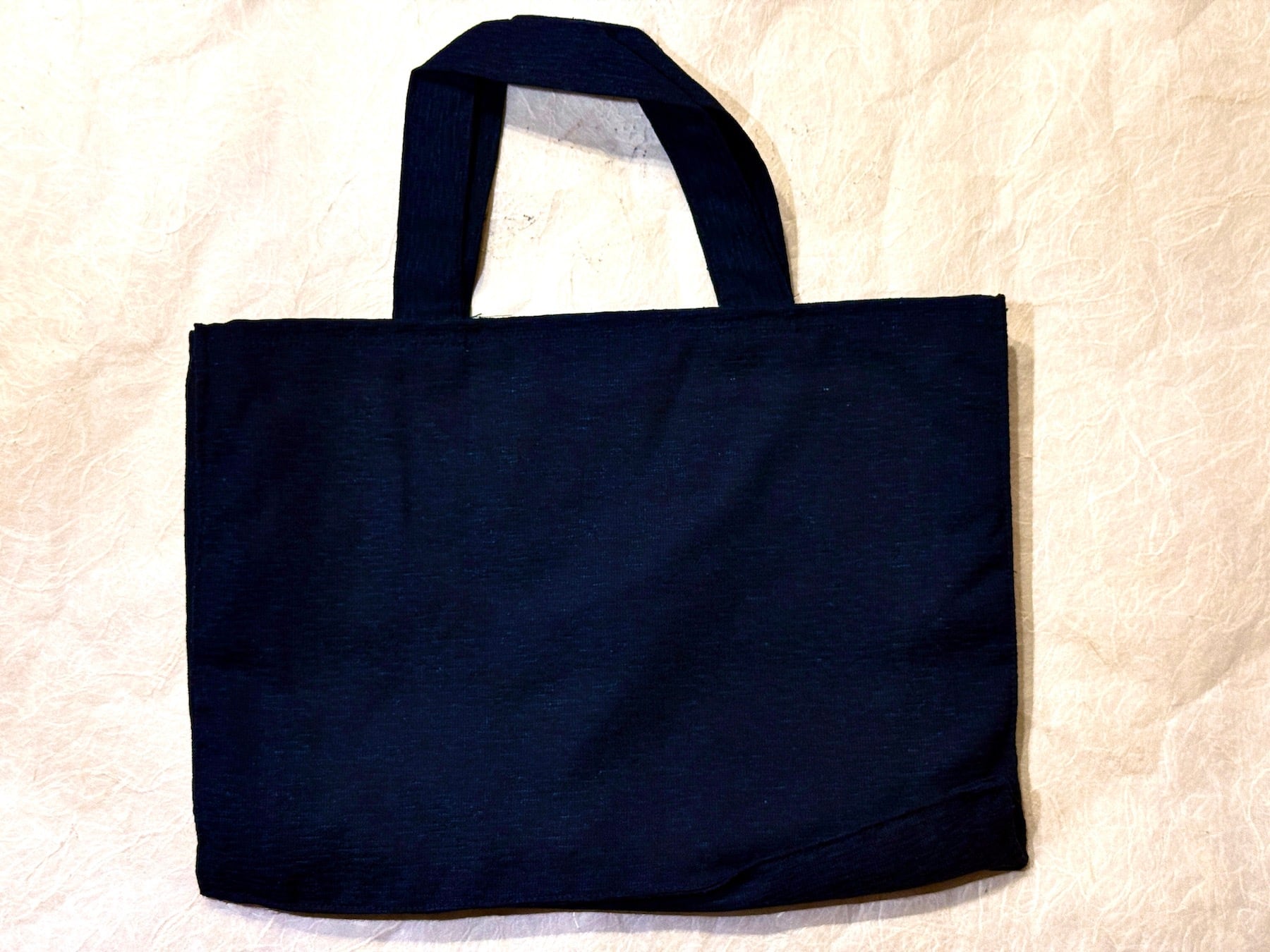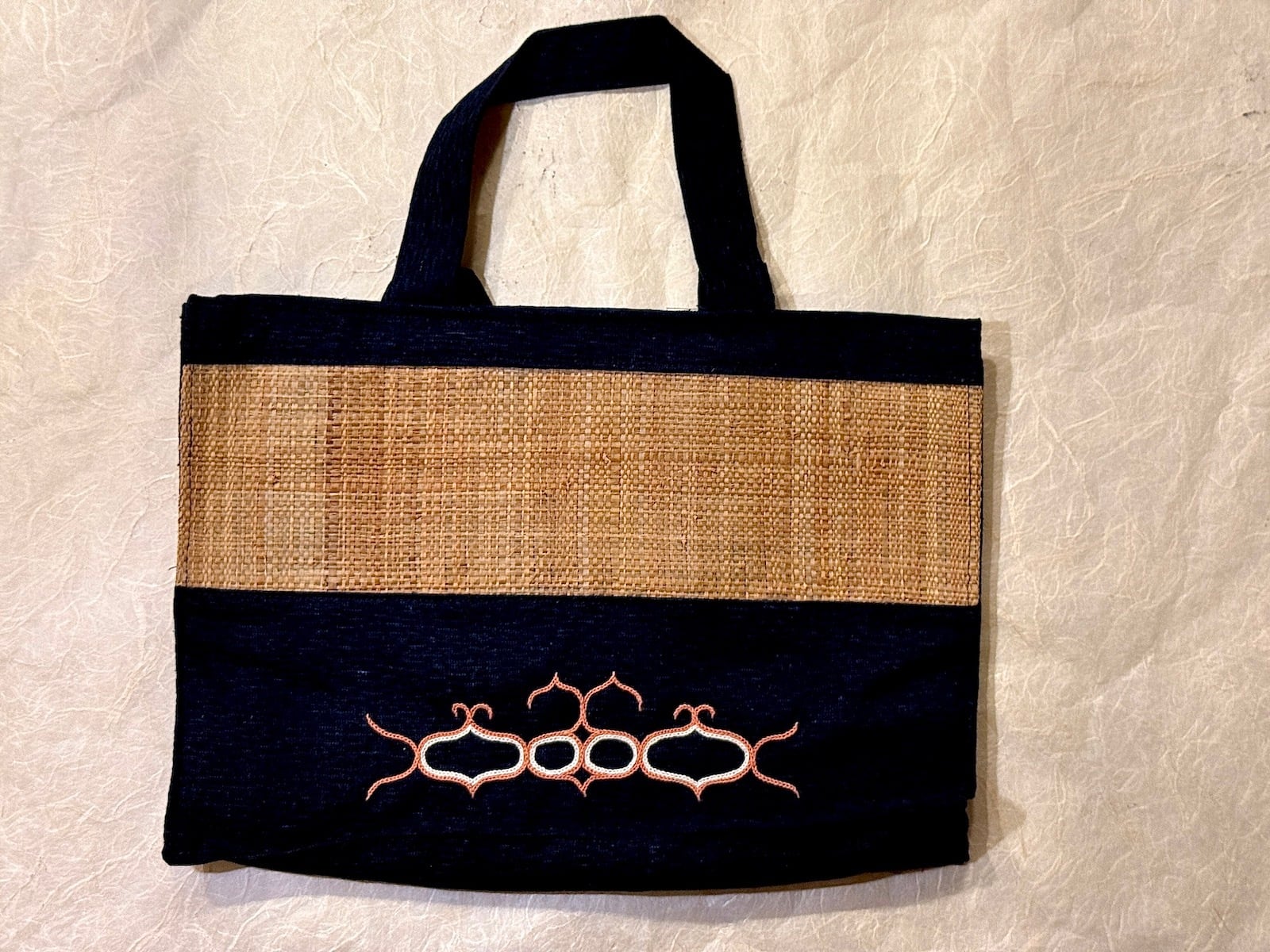オヒョウニレの木の皮をはいで、糸状にしたものを織り込んだバックです。刺繍は、アイウシ(棘)文様をメインに施しました