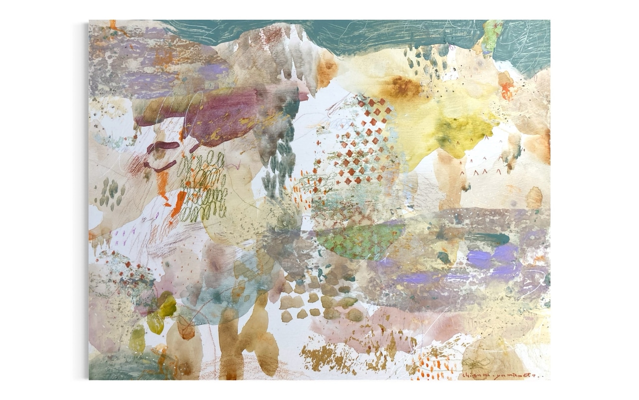 「この作品は、色彩や痕跡が重なり合う中で即興的に生まれた抽象画です。
