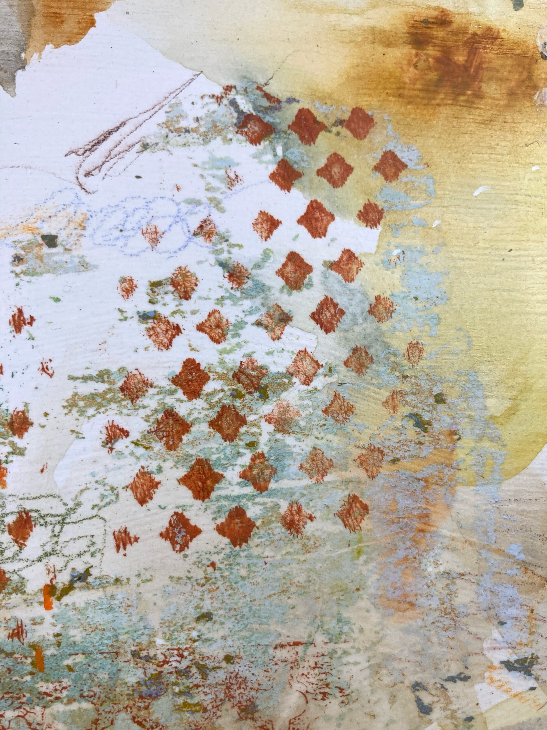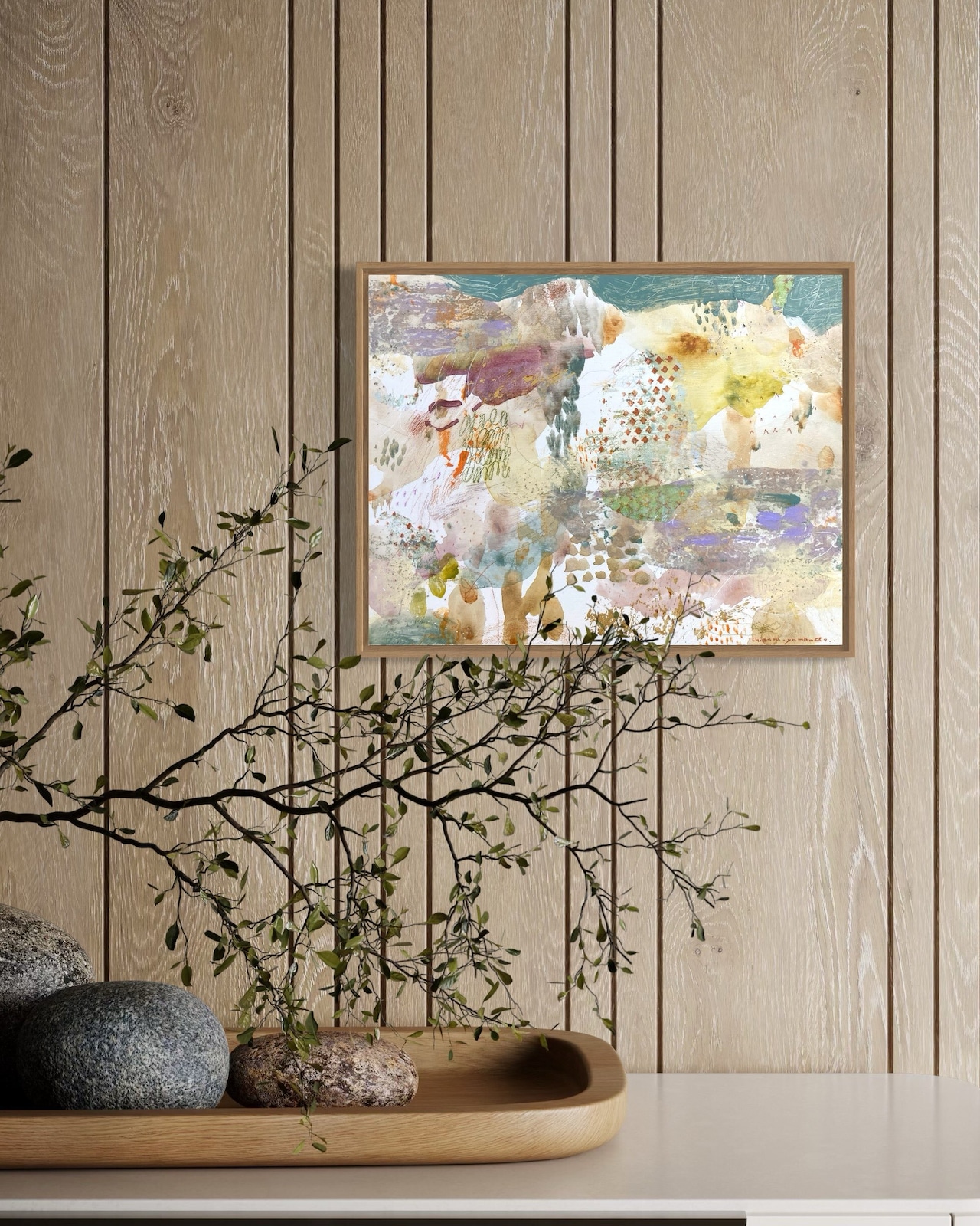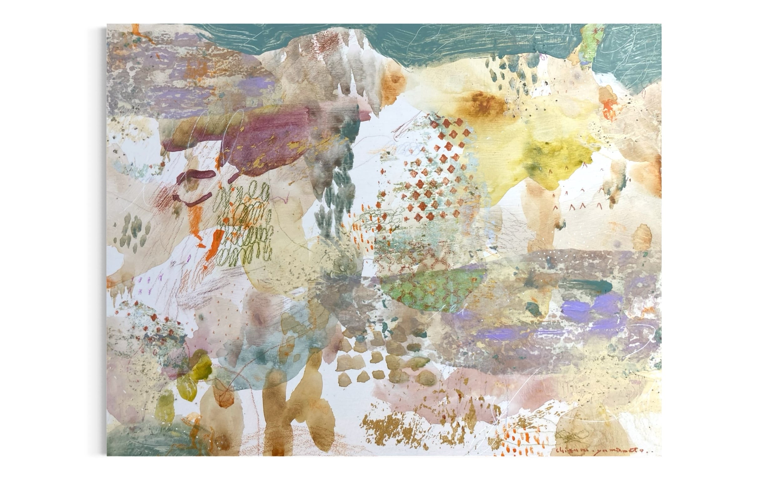木製のパネルに、アクリル絵の具でのペイントとジェリープリントで自作した紙をコラージュしたミクスドメディアの作品になります。紙は透明になり繊細に重なった景色を作ります。