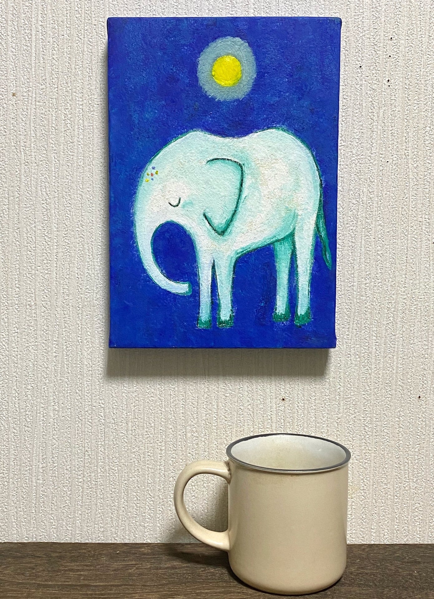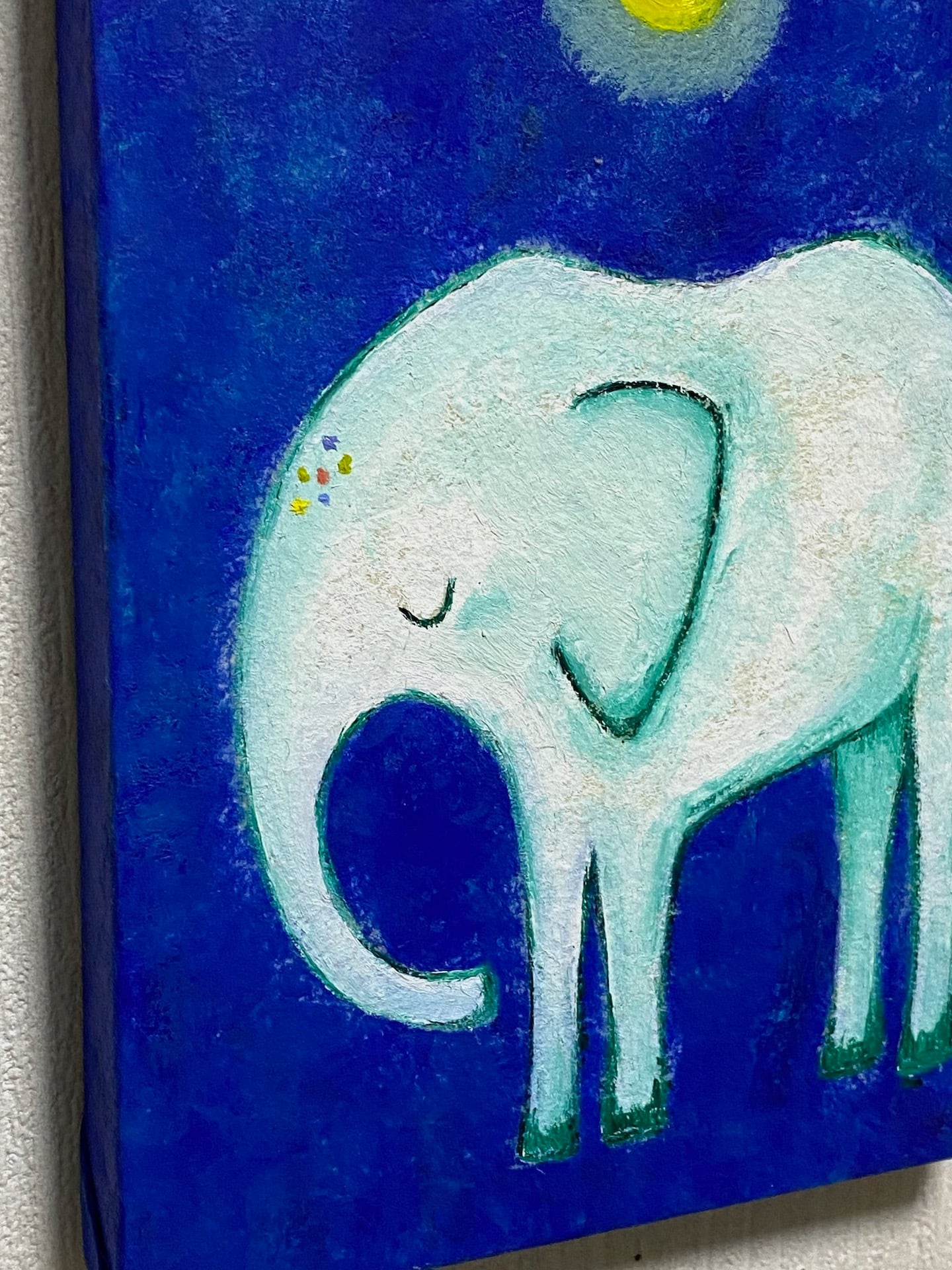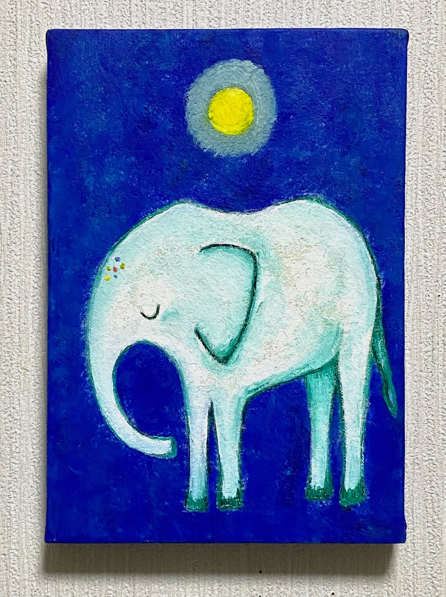 「優しい月の光に照らされたひとりぼっちの白いゾウの絵。木製パネルに和紙を貼りそこに油絵具で描いた作品。」(松崎大輔)