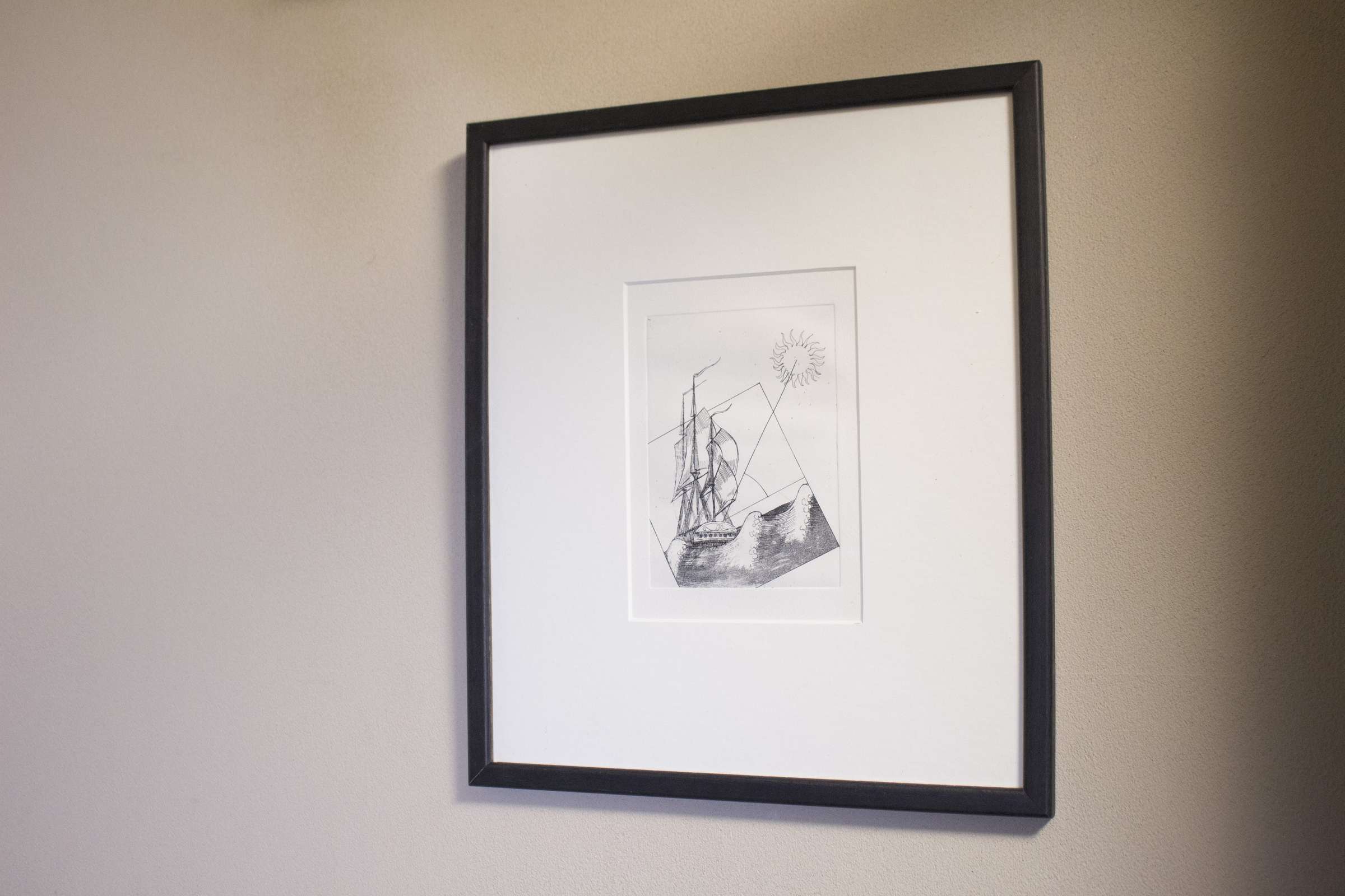 銅版画《untitled》は、彫刻を主な表現とする作家が描き溜めたドローイングやメモの中から、折に触れて残したいと思ったものを版に起こしたものです。