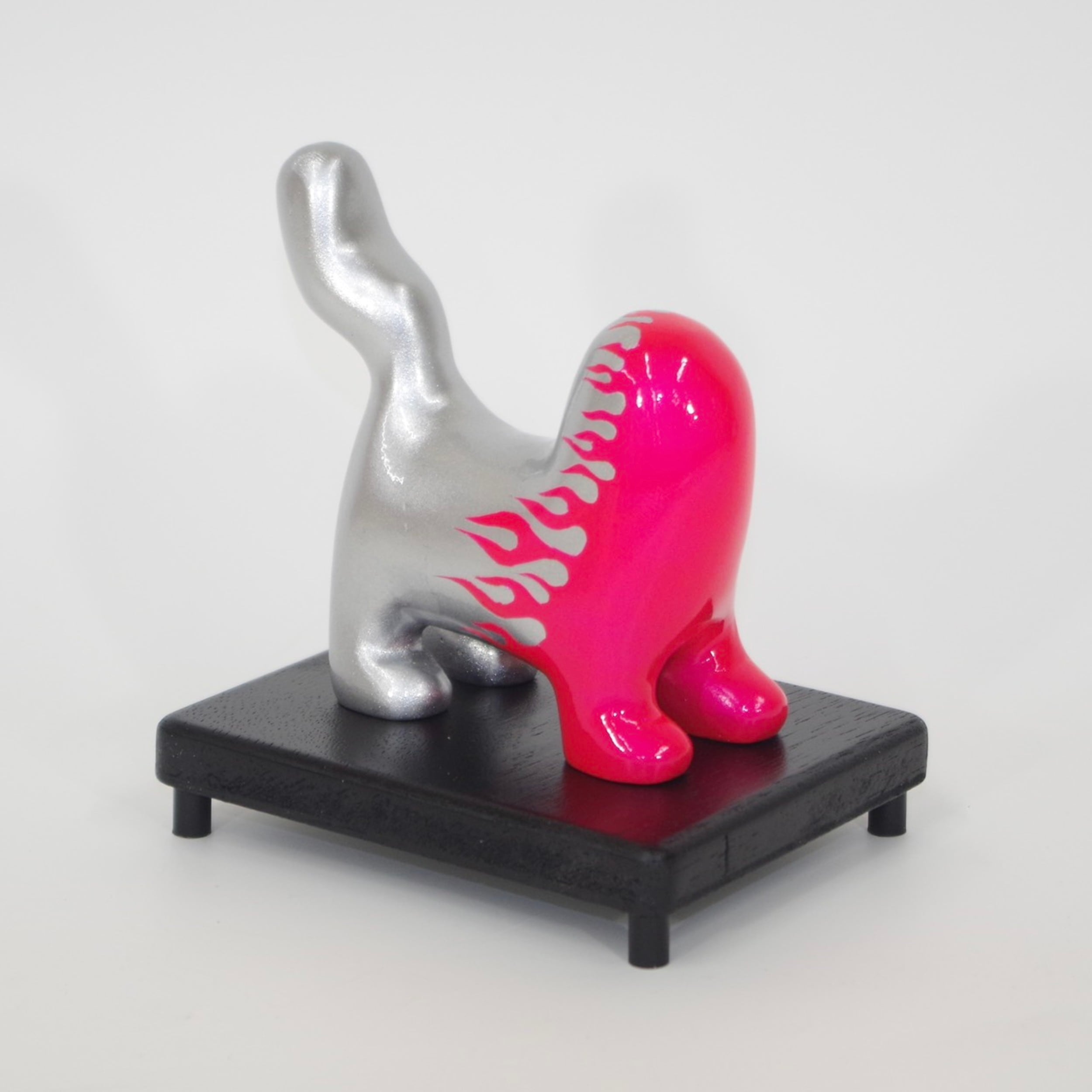 犬をデフォルメしたゆるやかなフォルムと鮮烈な色彩を融合した本作は、内なるエネルギーとの爆発を象徴する。ファイアーパターンが情熱と変化を表現している。