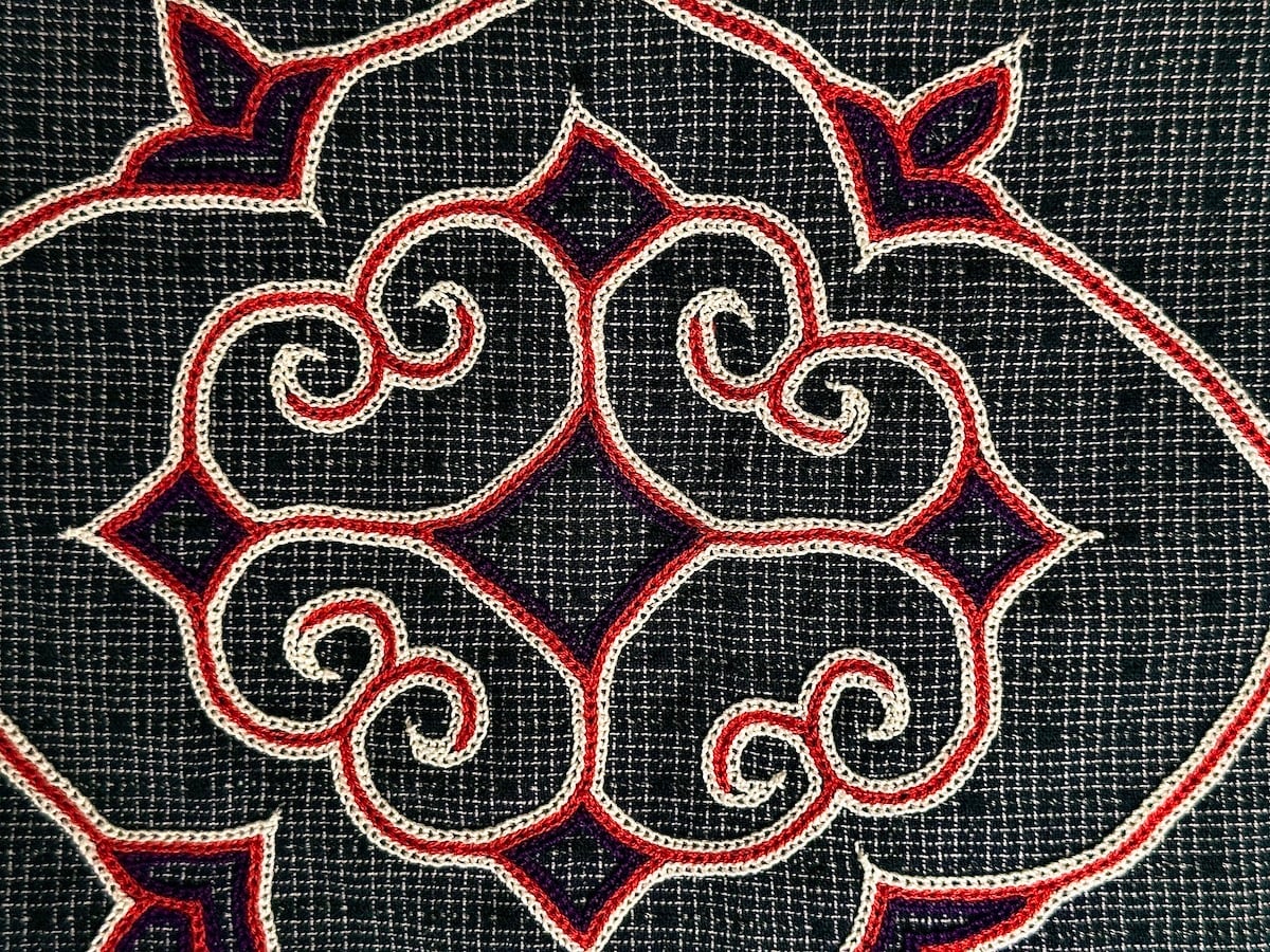北海道、二風谷を拠点に「沙流川を守る会」「山道アイヌ語・職業訓練校」、37年にわたる「アイノモシリ一万年祭」の主宰者、活動家としてアイノ精神文化や先住民の権利、自然環境を護る様々な活動や祈りの儀式であるカムイノミをされ、ビッグマザーでありトゥスクルでもあるアイノ民族の高名なフチ(高齢の女性に対する尊称)、アシリ・レラ氏によるアットゥシ織(アイノ民族の伝統的な、オヒョウの樹皮から採取した樹皮から複雑な工程を経て繊維を作り、織り上げた大変手間暇のかかる織物、丈夫で貴重な為晴れ着など特別な機会の着物に仕立てる)の布に刺繍を施したタペストリーです。