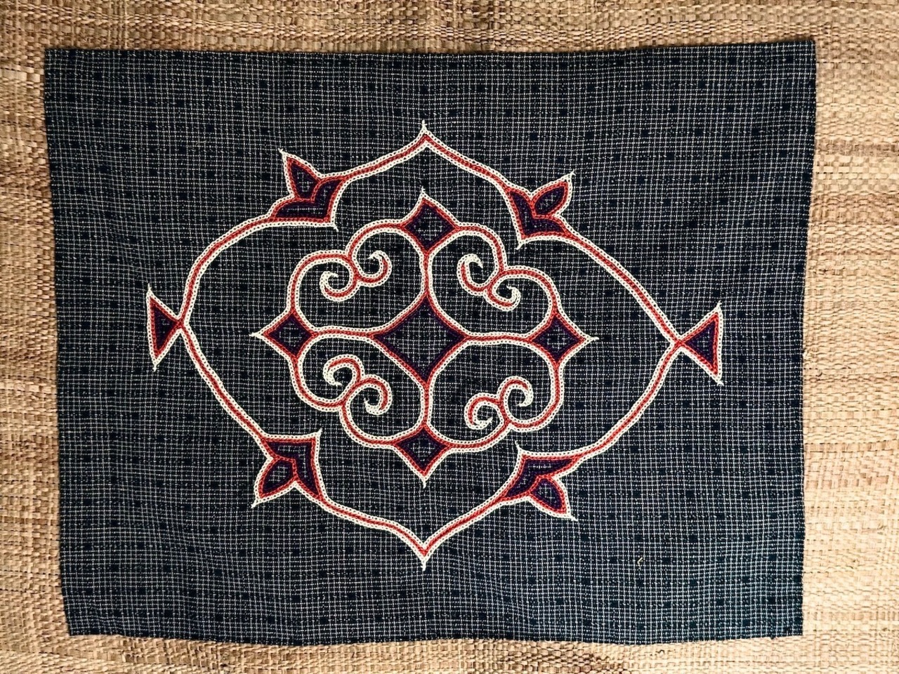と四方の守護のカムイシク(神の目)で強力な守護を表す紋様を刺繍した作品になります。