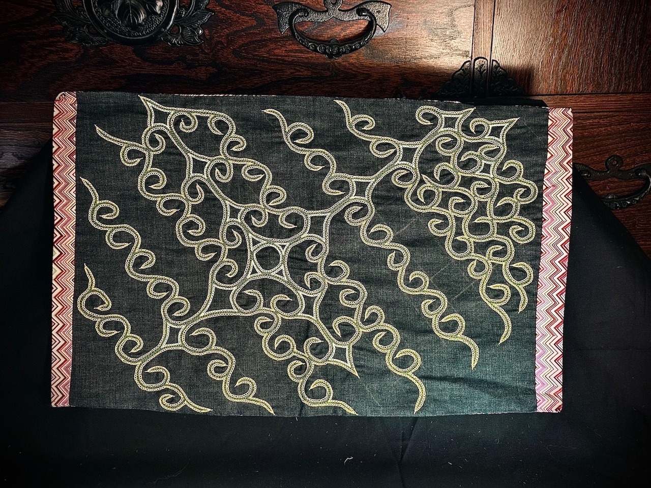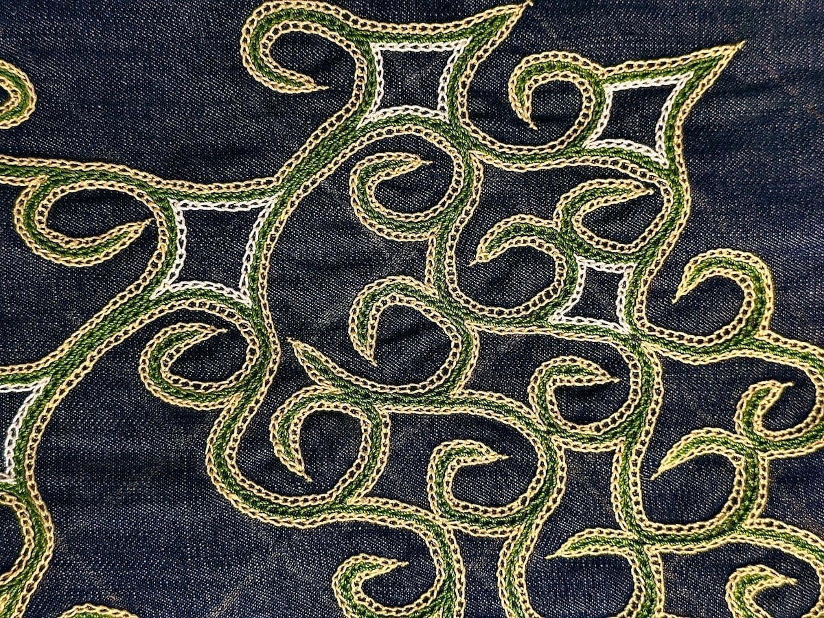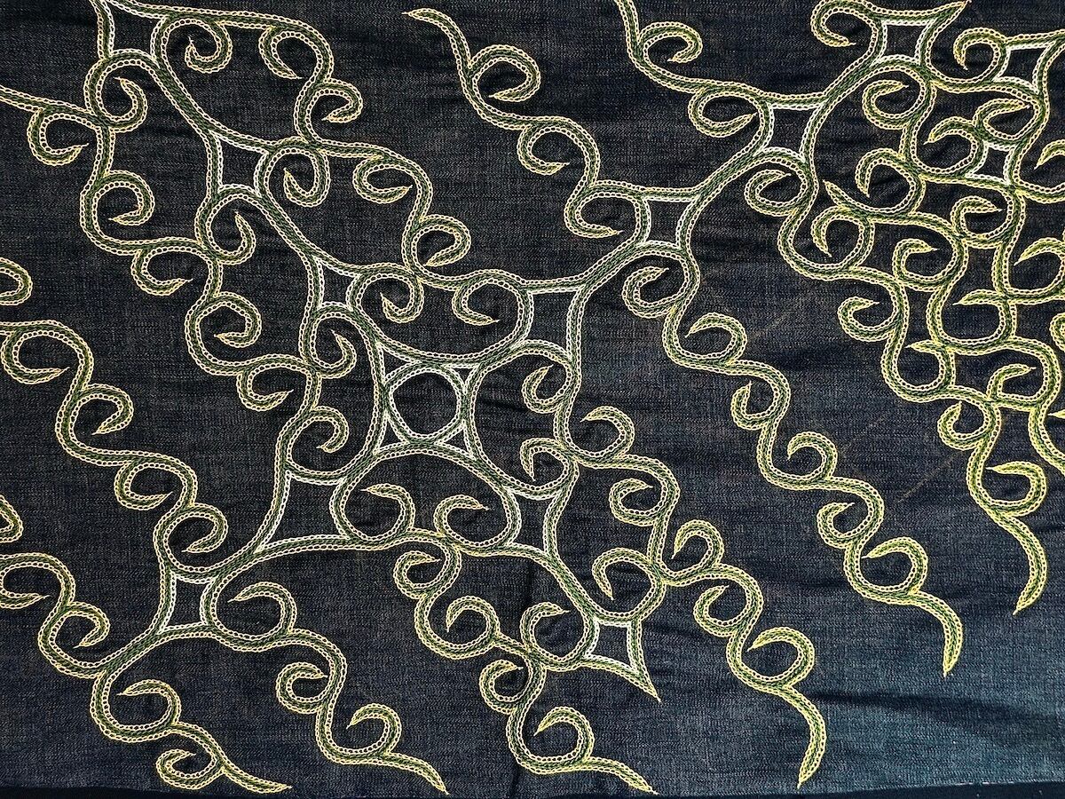 古来、アイヌの女性たちは愛する者や家族たちがいち早く神様に見つけられ魔から護られるようにと祈りを込めて着物の襟足や袖や裾、背中と前面の合わせに美しくカムイシク(神の目)、モレウ(渦巻き)、アイウシ(棘、魔を刺す)、コタンコロカムイ(村を護るしまふくろうの神様)などの紋様を、基本となるチェーンステッチ、二本の糸で一本を抑えながら縫うイカリカリや、エタラカ(出鱈目、元々は蜘蛛の女神の織物を意味するヤオシケプ、網の目刺繍)と呼ばれる熟練者の遊び心のある縫い方を組み合わせて刺繍をしました。その紋様は代々受け継がれ、また新たな工夫をされ受け継がれてゆくものです。