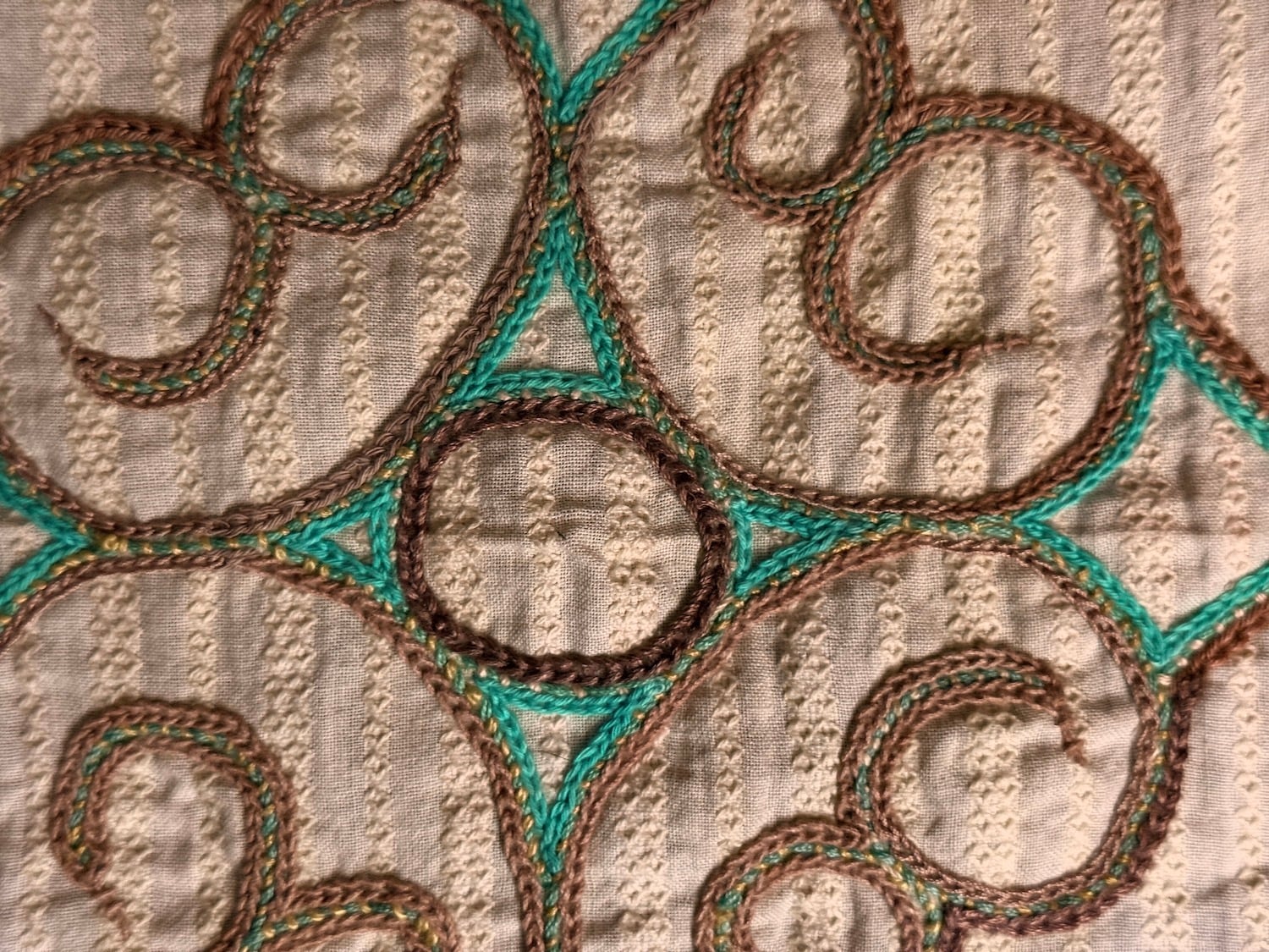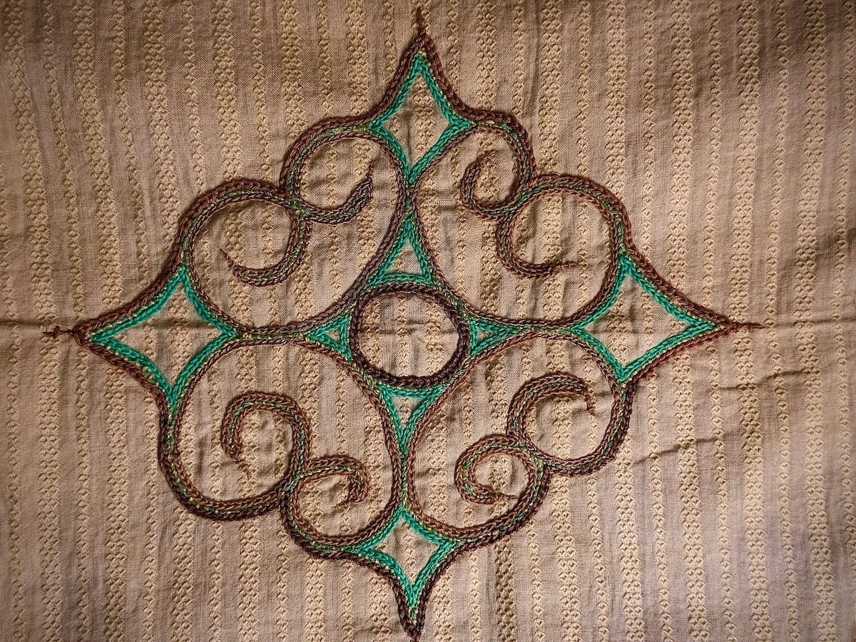 古来、アイヌの女性たちは愛する者や家族たちがいち早く神様に見つけられ魔から護られるようにと祈りを込めて着物の襟足や袖や裾、背中と前面の合わせに美しくカムイシク(神の目)、モレウ(渦巻き)、アイウシ(棘、魔を刺す)、コタンコロカムイ(村を護るしまふくろうの神様)などの紋様を、基本となるチェーンステッチ、二本の糸で一本を抑えながら縫うイラカリや、エタラカ(出鱈目、元々は蜘蛛の女神の織物を意味するヤオシケプ、網の目刺繍)と呼ばれる熟練者の遊び心のある縫い方で刺繍をしました。その紋様は代々受け継がれ、また新たな工夫をされ受け継がれてゆくものです。