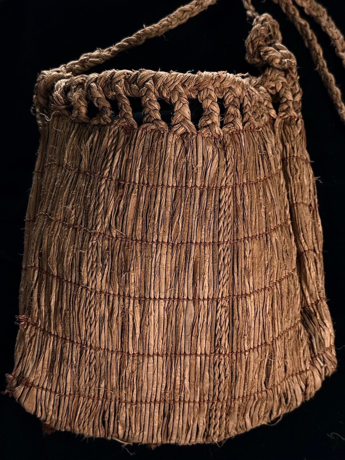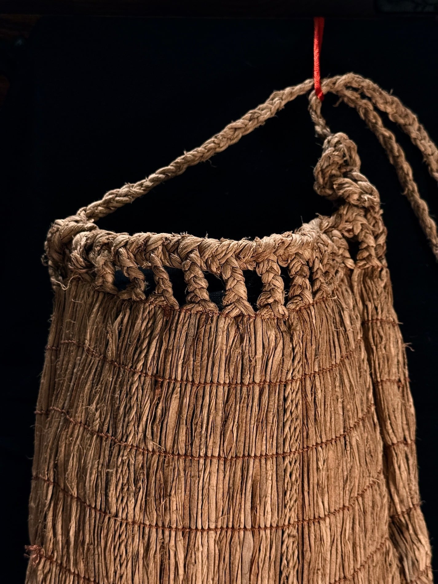 北海道、二風谷を拠点に「沙流川を守る会」「山道アイノ語・職業訓練校」、37年にわたる「アイノモシリ一万年祭」の主宰者、活動家としてアイノ精神文化や先住民の権利、自然環境を護る様々な活動や祈りの儀式であるカムイノミをされ、ビッグマザーでありトゥスクルでもあるアイノ民族の高名なフチ(高齢の女性に対する尊称)、アシリ・レラ氏らによるシナ、オヒョウの樹皮繊維から糸を作り編んだポシェットです。