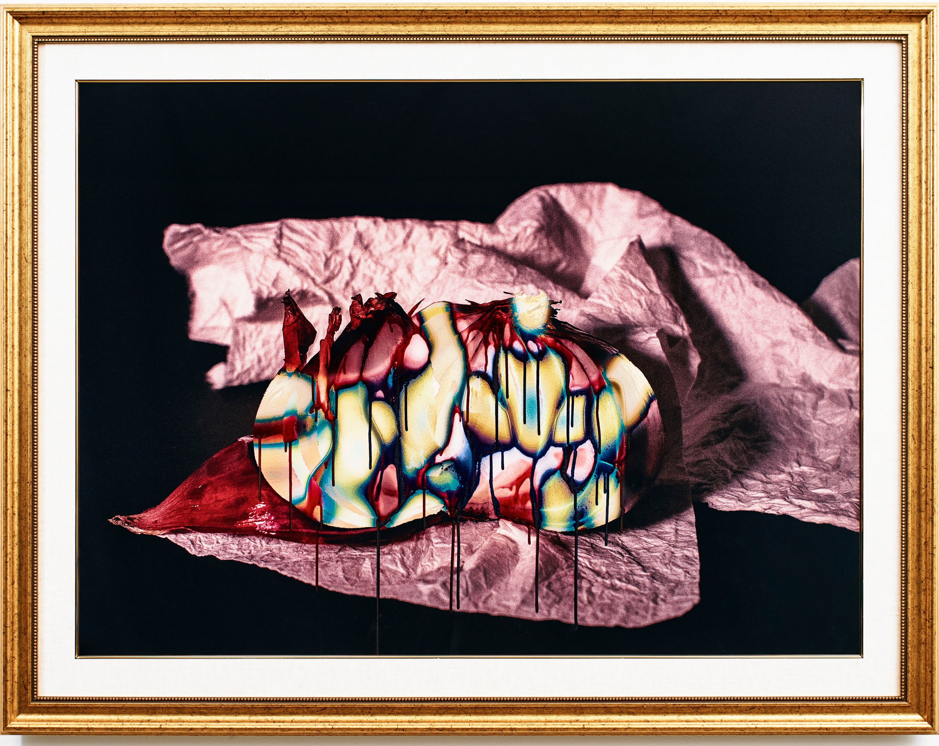 近世スペインで盛んに描かれたボデゴン画に似せた写真の上に、写っている食材をナイフで切る音のソノグラフ(音を周波数帯ごとに分解して強さをグラフ化する装置)をヒートマップ化してインクジェットで吹き付け、遅乾性インクが固まる前に用紙を傾けてインクを流下させています。