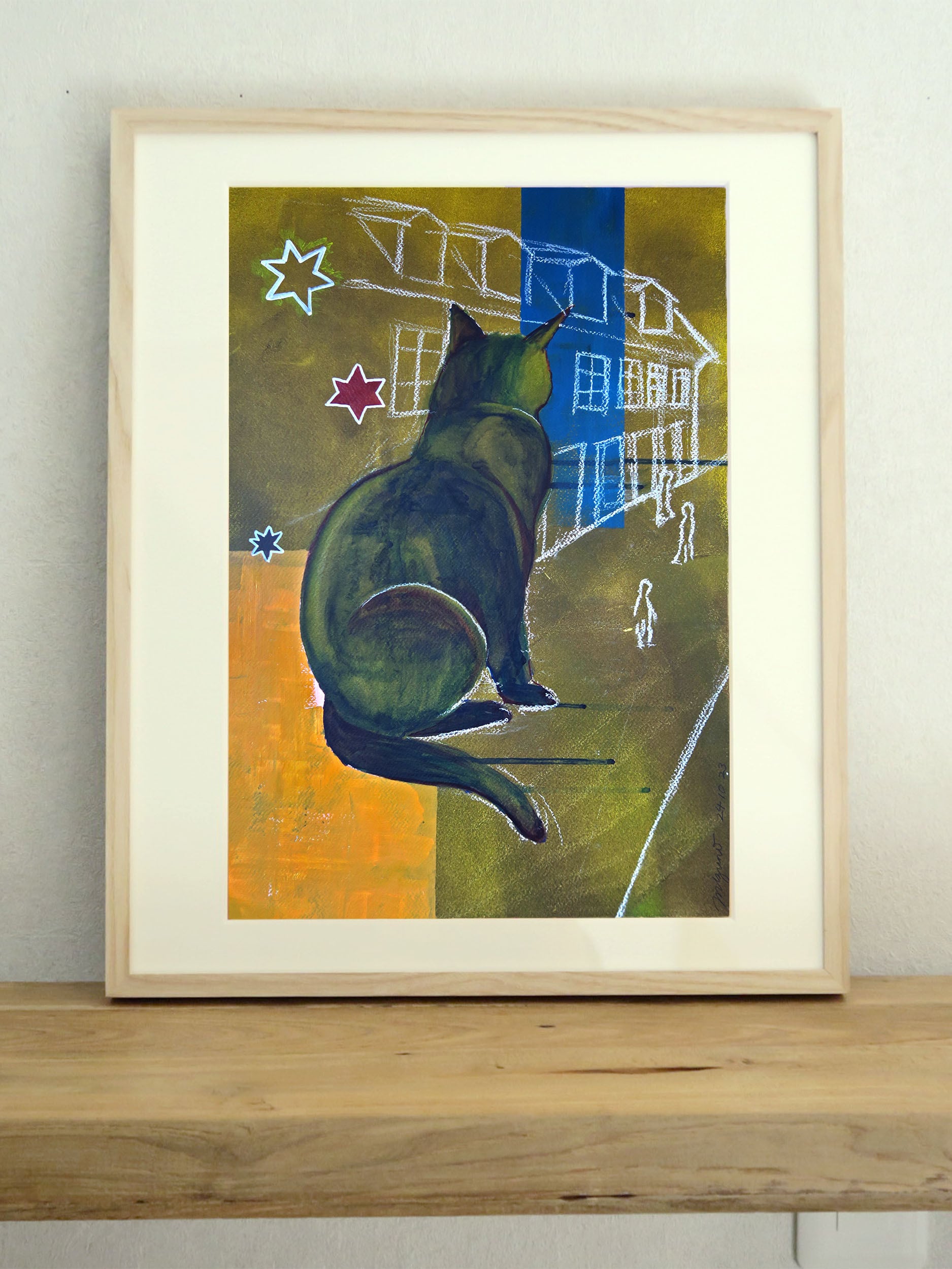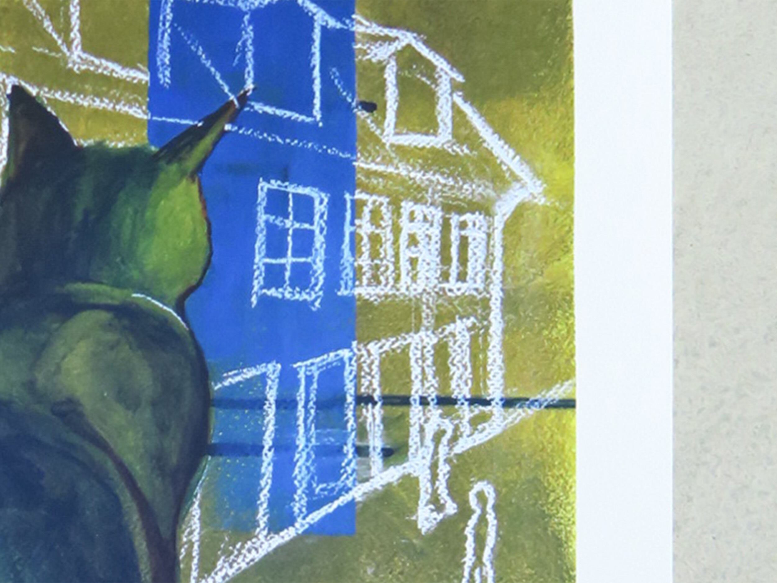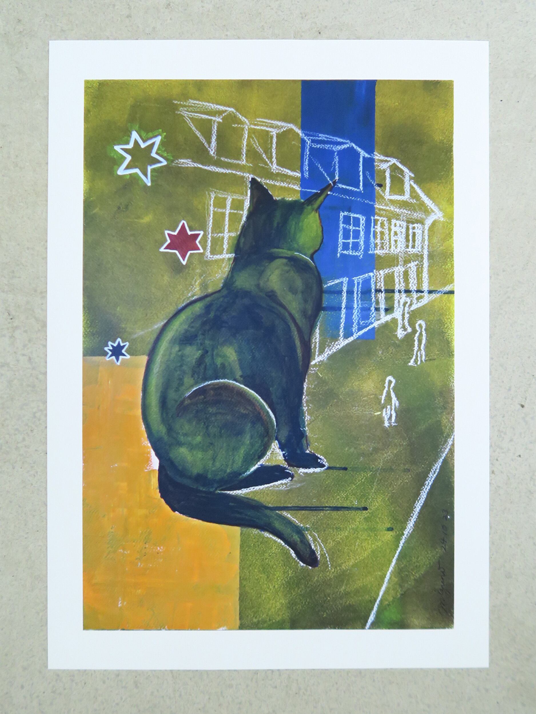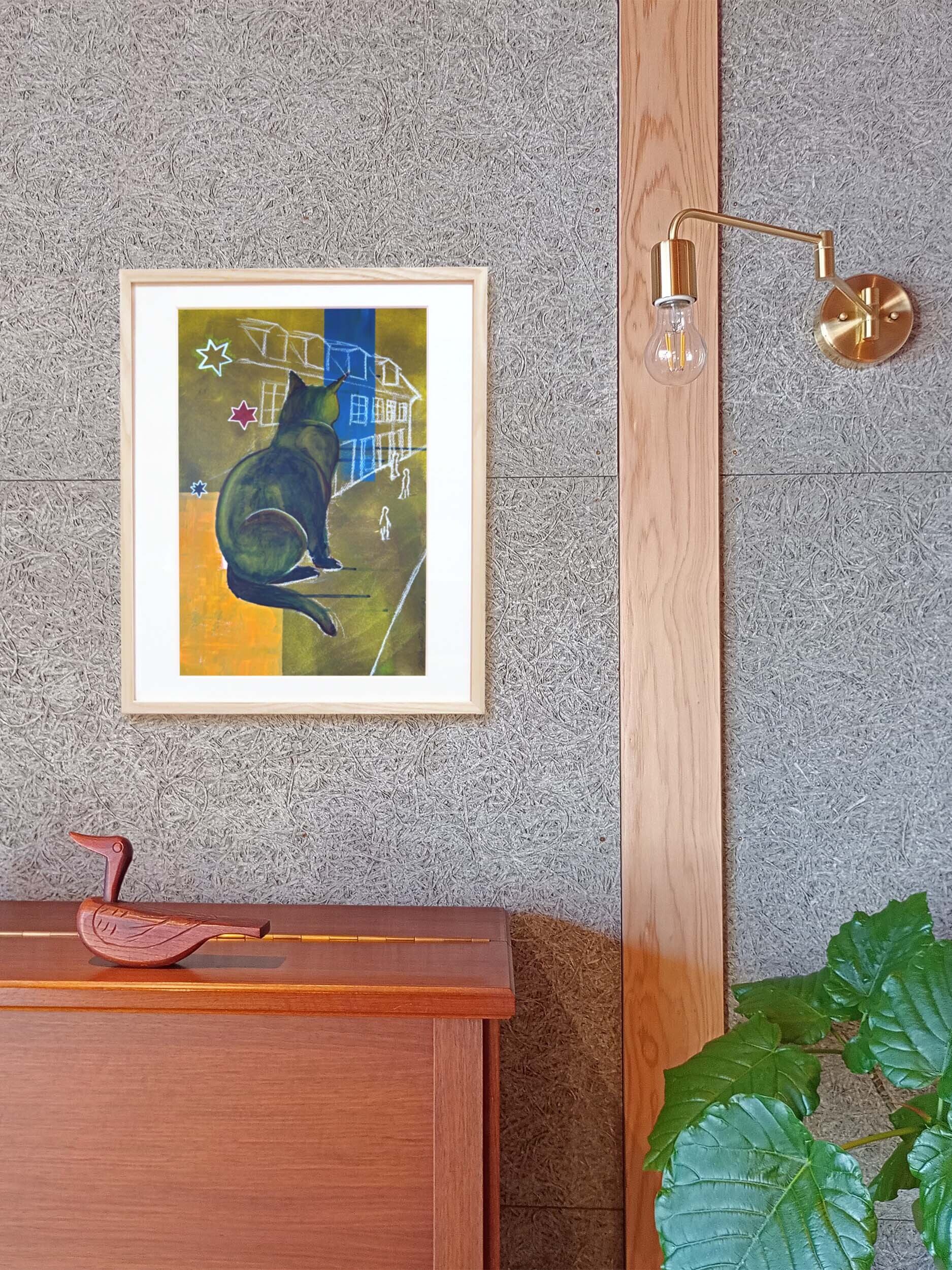 「デンマークに短期留学時、美術の授業で描いた絵。寄宿学校にいた猫とデンマーク第2の都市オーフスの景色をモデルにしている。「普通は目に見えない大きな猫」という設定で、道行く人間を静かに観察している様子を表現した。見守っているような、寂しげなような。「Kat i Aarhus - I」と対となる作品。」(SAYA MIZUNO)