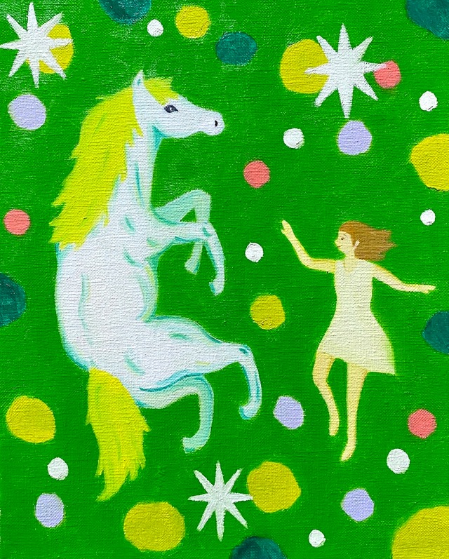 「自然の中で楽しく踊る女性と白馬を描いた作品。」(松崎大輔) メディア:油彩、キャンバス サイズ:タテ27.3 cm ヨコ 22cm 高さ 1.8 cm 松崎大輔先生 公式ウェブサイト:https://daisukematsuzaki.wixsite.com/artist インスタグラム:https://www.instagram.com/daisukematsuzaki326/ 【重要】こちらの商品は12月6日の夕方以降に広野町の余白のアートフェア会場にてお渡し、または12月7日の夕方に着払いにての発送となります